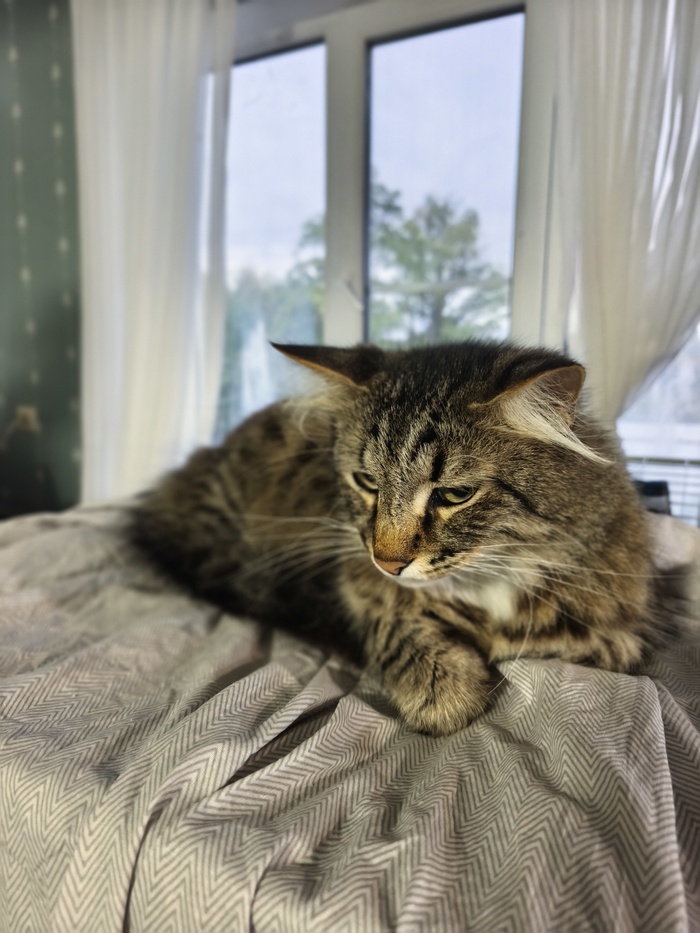 А это довольный кот Боча, уютно устроившийся на моей сохнущей новой рубахе. Я ее еще не надевала ни разу, зато кот уже на ней свою шерсть раскидал!