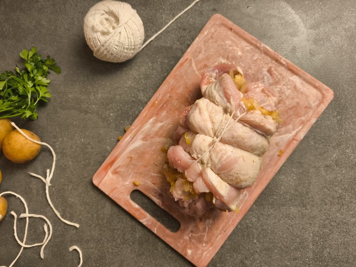 6.А теперь вооружаемся кулинарной нитью. Аккуратно сворачиваем мясо в рулет и связываем)
