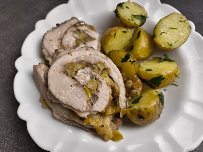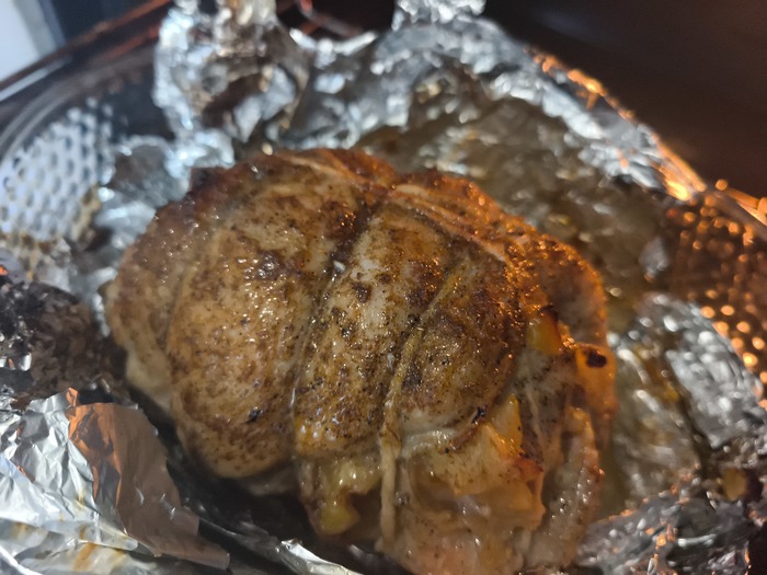 7. Заворачиваем рулет в 2 слоя фольги и отправляем в духовку на 180 градусов на 1,5 часа. За 10 мин до готовности фольгу раскрываем и румяним мясо минут 10, периодически поливая выделившимся соком.