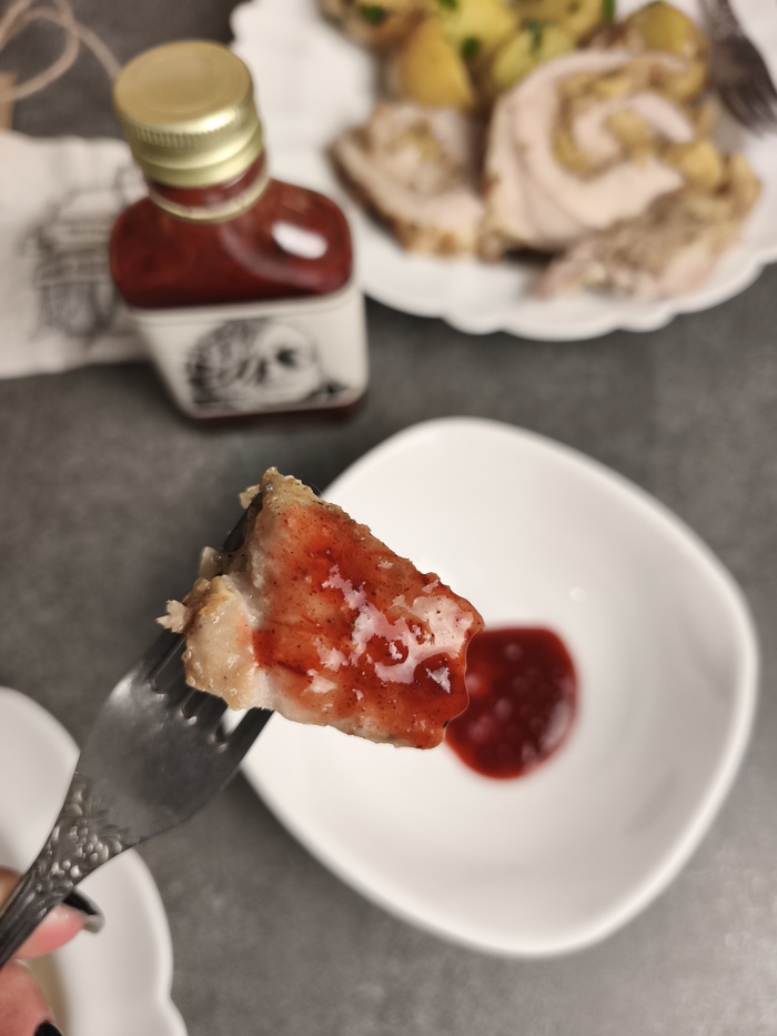 Соус, кстати, весьма и весьма к месту: он не кисло-сладкий, а такой как табаско. Только с брусничным оттенком и не острый, а скорее греющий. То есть не с разбега в язык впивается, а потихоньку набирает тепло. В общем, мне вкусно, но мало.