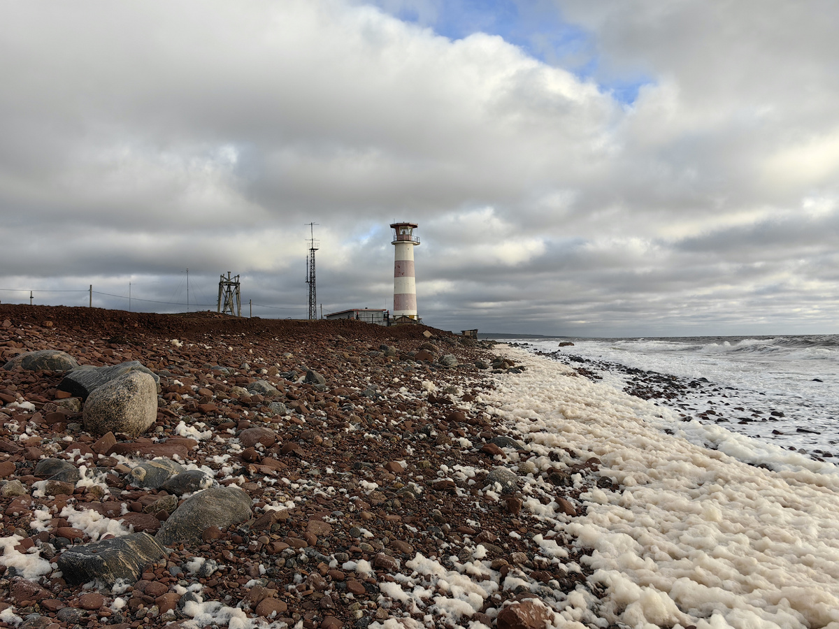 Не какой-нибудь старинный и романтичный, а суровый функциональный объект 1978 года постройки, принадлежащий Минобороны, кажется, или метеорологам. Он стоит как страж, молчаливый и непререкаемый. Подойти к нему, ощутить эту мощь — это уже путешествие. Первый маяк был построен здесь в 1938 году в виде навигационного знака, но из-за ветхости поставили этот. С тех пор и служит он безопасности судов, идущих из Белого моря в Кандалакшский залив.