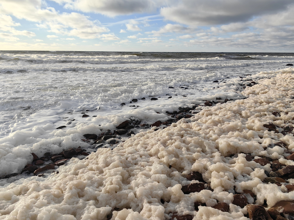 Берег был накрыт густой белой пеной. Небо свинцовое с редкими проблесками, картинка максимально живописная. Тревожная даже. Присела на камень, уставилась далеко в море и таааак меня там пробрало. Но не от пронизывающего ледяного ветра, от ощущения мира, природы, её могущества и власти над нами.