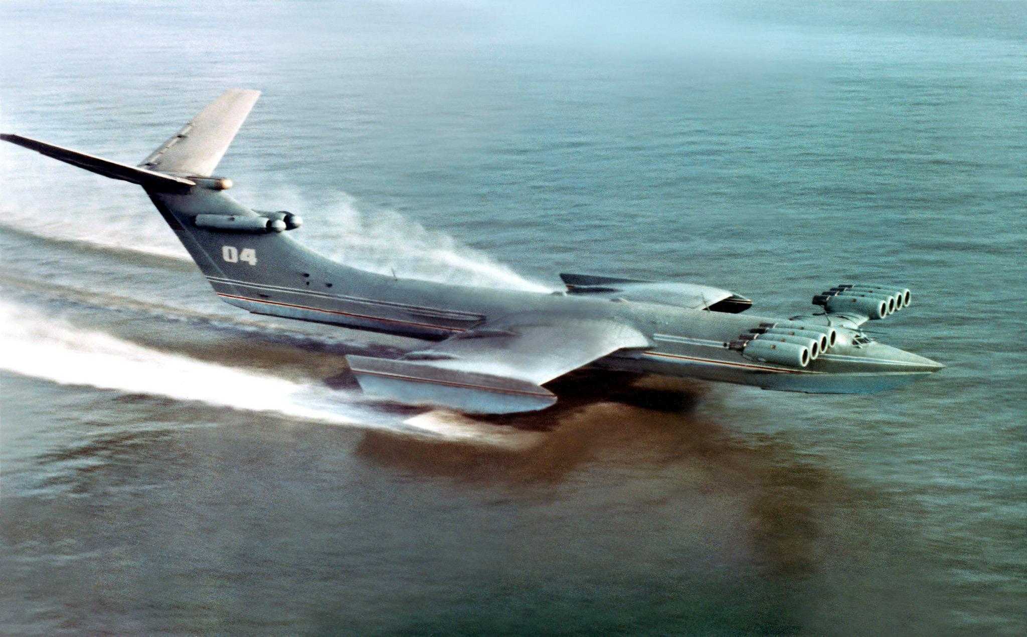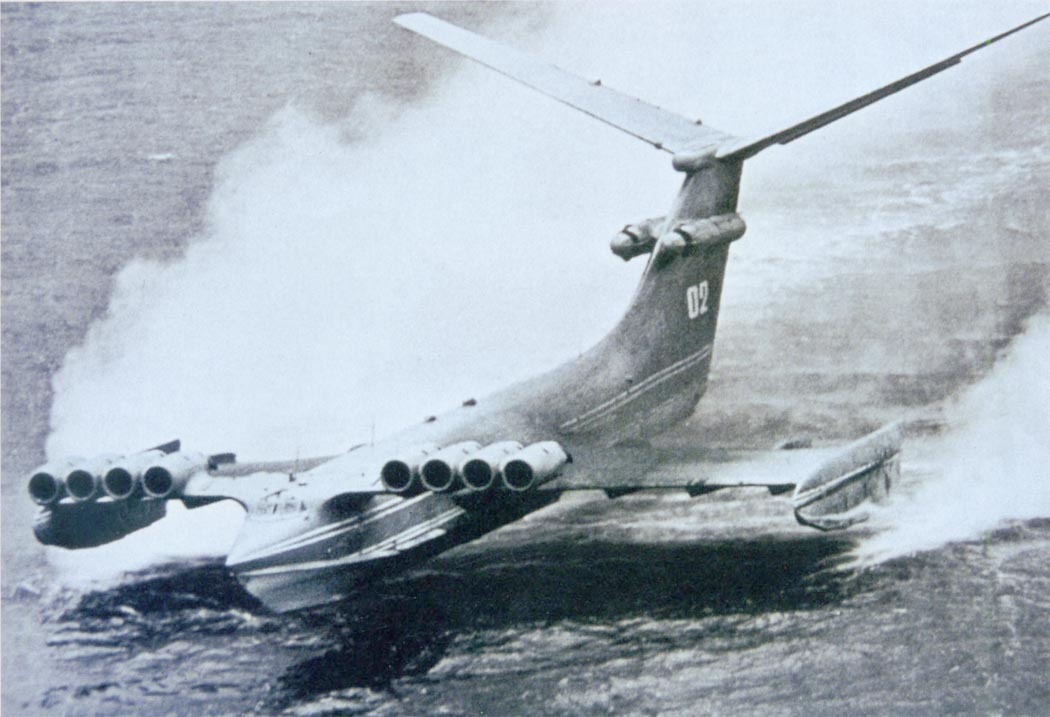 Первая публикация об экранопланах появилась в ТМ в 1972 году. Это было интервью с американцем Александром Липпишем - создателем лодок, скользящих по воздуху над водой. Как о диковинке узнал советский читатель об одноместном экраноплане Х-113 массой 345 кг. В конце беседы конструктор поделился своей мечтой построить 500-тонный лайнер, способный пересекать океаны со скоростью 200 км/ч и нести 240 т полезной нагрузки. В ту пору всем нам было невдомек, что подобные машины созданы уже почти 10 лет назад и не в секретных ангарах Локхида или Боинга, а на берегу Волги, под Горьким - ныне вновь Нижним Новгородом. И уникальные аппараты, и имя их главного конструктора до последнего года держались в тайне. На Западе же о корабле-макете знали не только спецслужбы, но и любой интересующийся подобной техникой. В одном из выпусков "Джейна"- популярного английского издания, посвященного военной технике всех стран - "Каспийский монстр" был охарактеризован так: "Гигантская советская экспериментальная крылатая машина, использующая влияние близости земли, с размахом крыльев 40 м, длиной более 90 м, проходит испытания на Каспийском море. Они начались в 1965 году. Аппарат, для которого оптимальная высота движения от 4 до 14 м над поверхностью, имеет потенциальную скорость 560 км/ч ..."