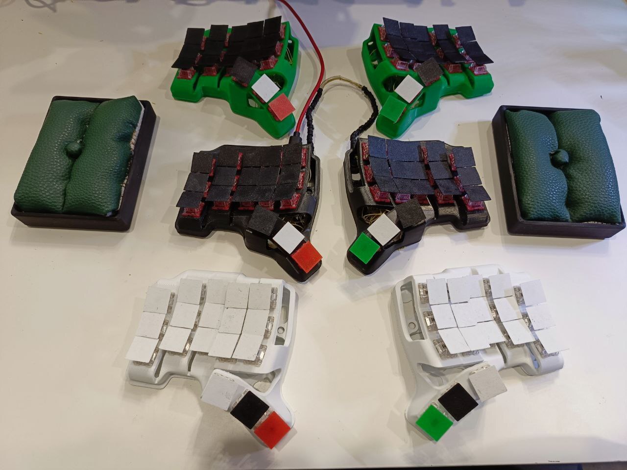 Научился "печатать на продажу" пластиком ABS, лить силикон (для проставок между клавиатурой и столом) и делать матрицы для заливки, красить и обрабатывать пластик, много паять. Устранил проблему при которой промышленные варианты имеют проблему отвала второй половинки (правой клавиатуры).