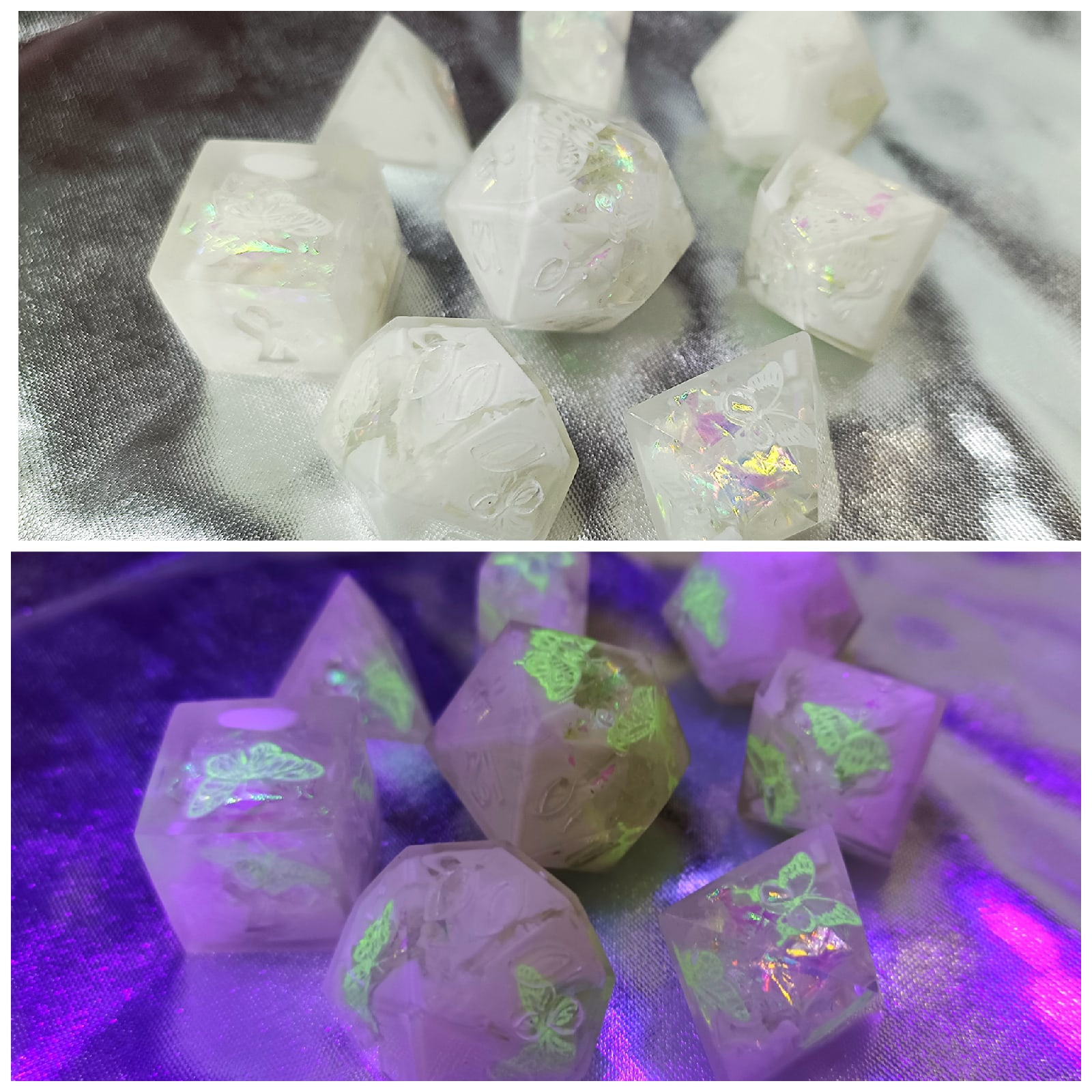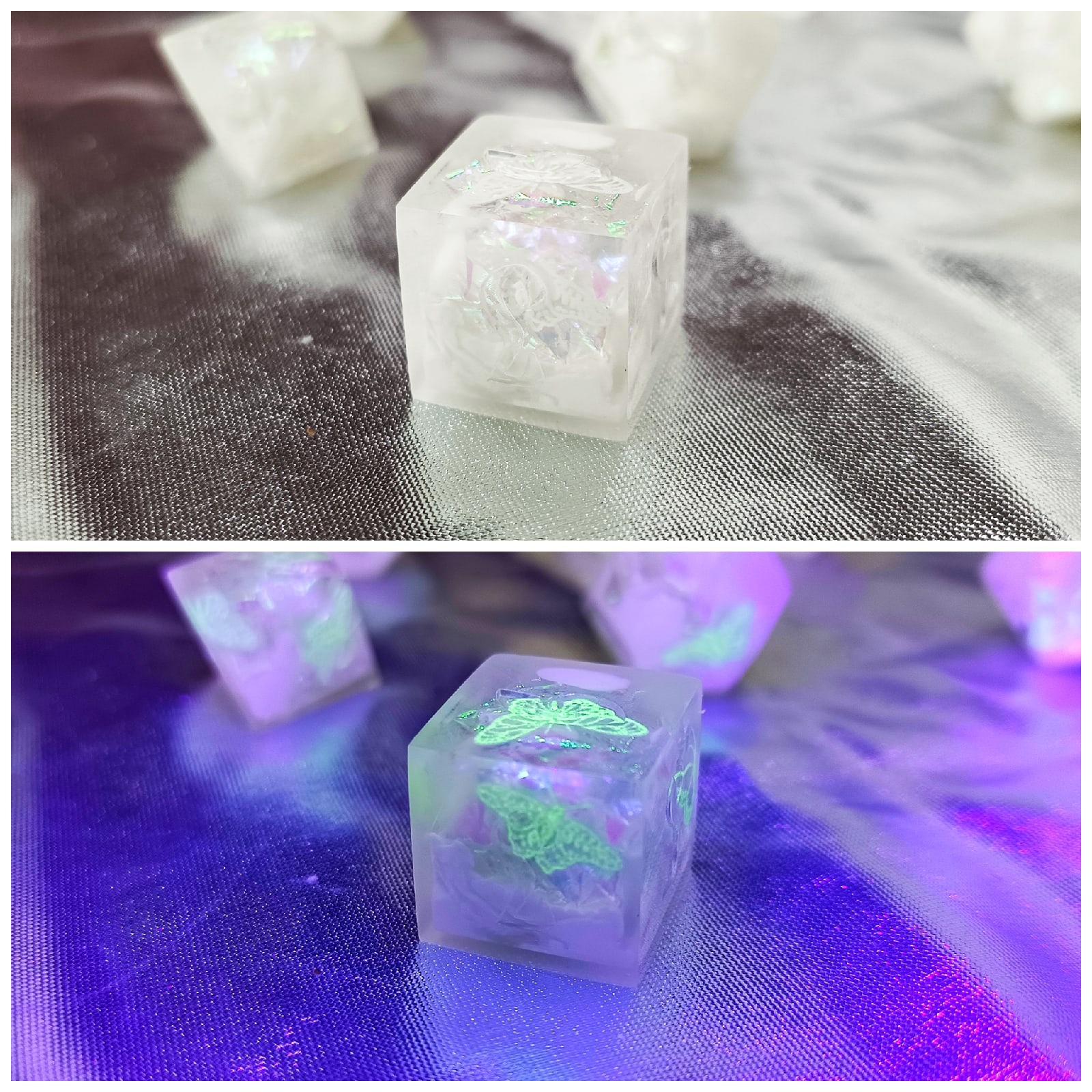 Он тоже заливался в два этапа, чтобы защитить наклейки с бабочками. В этом сете я нарочно хотела немного "спрятать" бабочек в элементах дайса, поэтому внутри находится радужная пленка с молочно-белыми разводами, в которых и сидят белые бабочки.