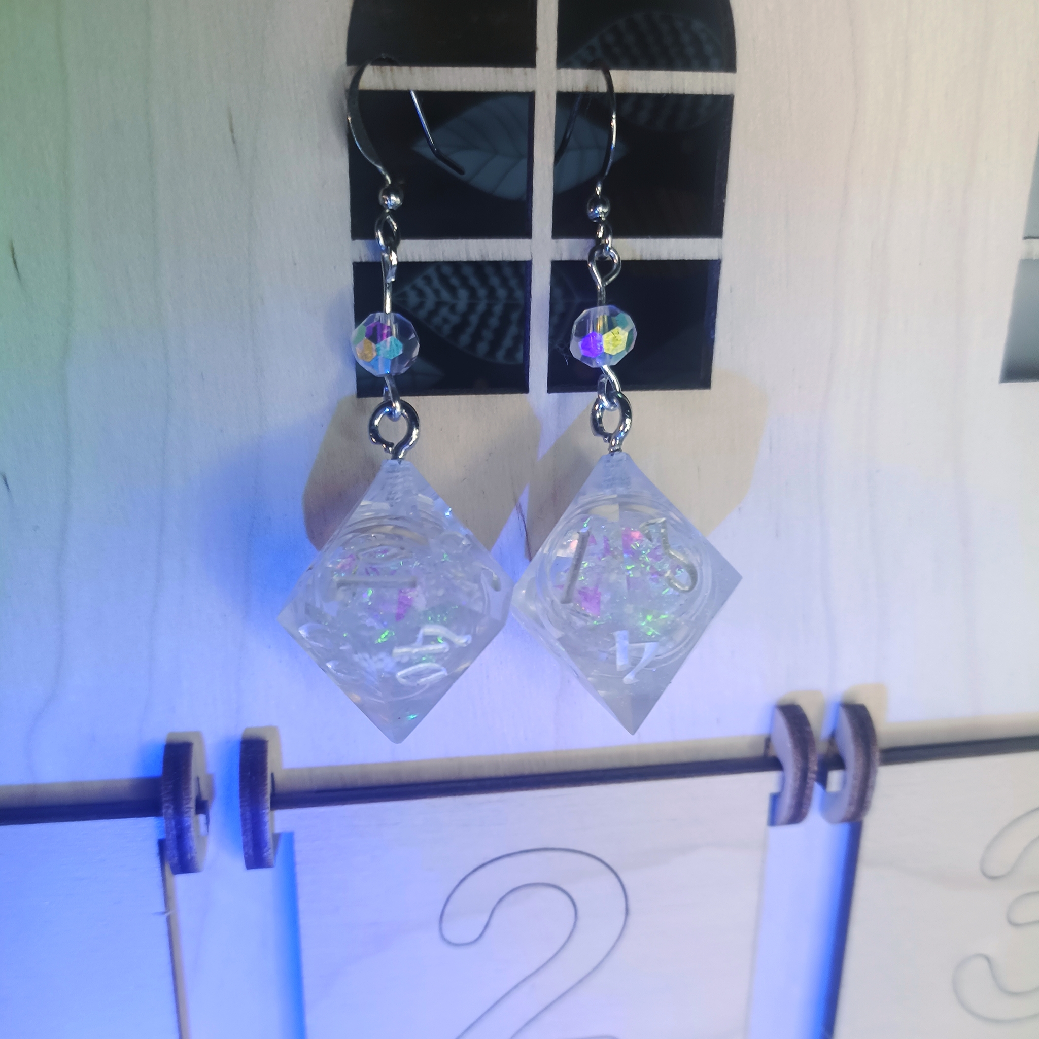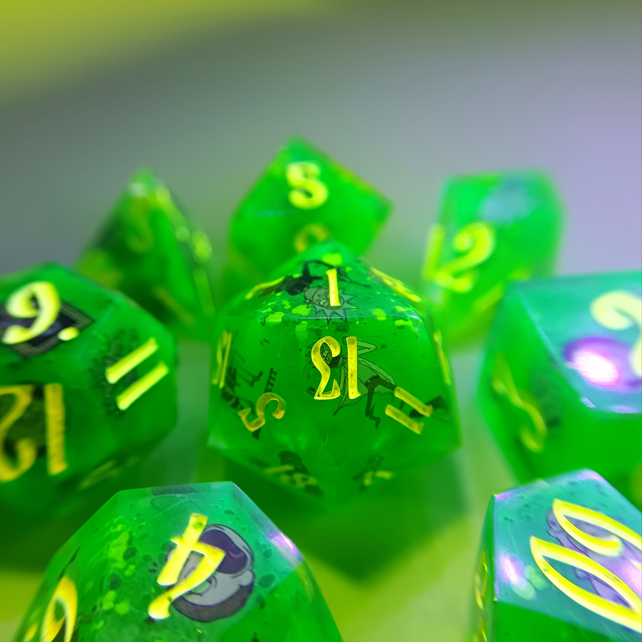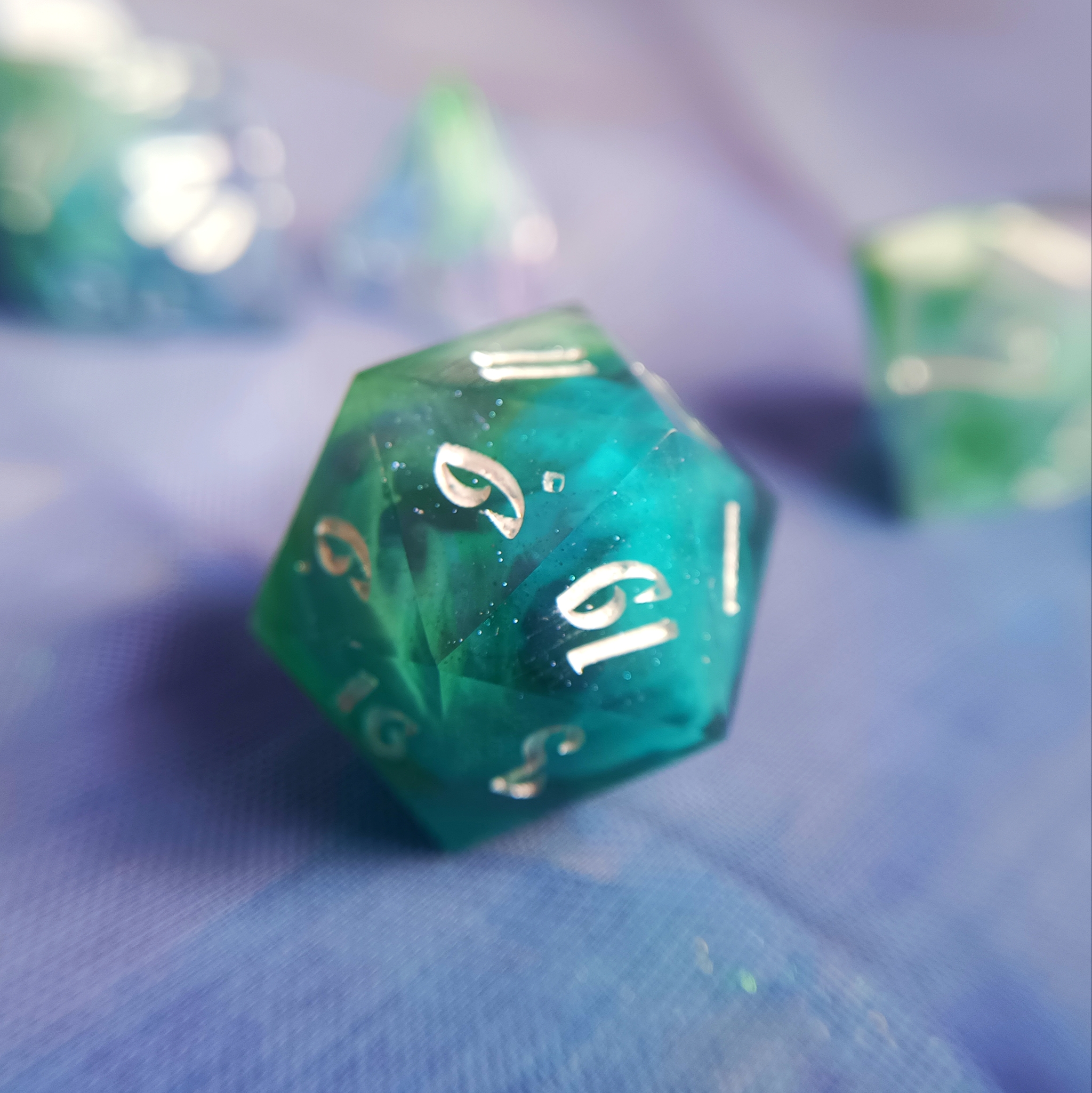 Дайсы с жидким центром, поэтому при встряхивании внутри образуется целая феерия блесток! Также набор содержит два д20, на одном из которых рог единорога вместо единицы :)