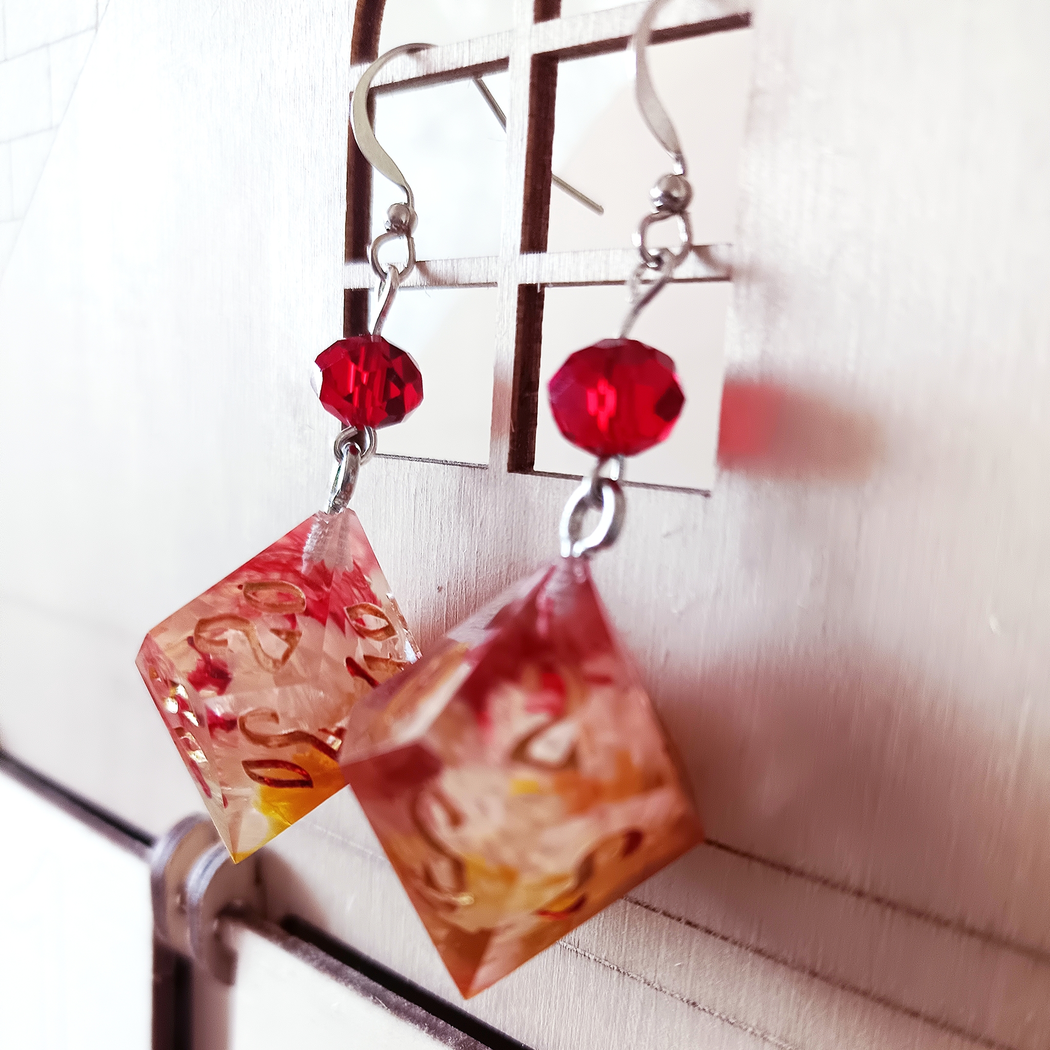 Первые сережки содержат в себе жидкий центр, при встряске которого внутри образуется подобие снегопада засчет мелких белых частичек. Второй набор включает в себя сережки и кулон, внутри находится белая гомфрена на подложке из золота и с кровавыми разводами вокруг :)