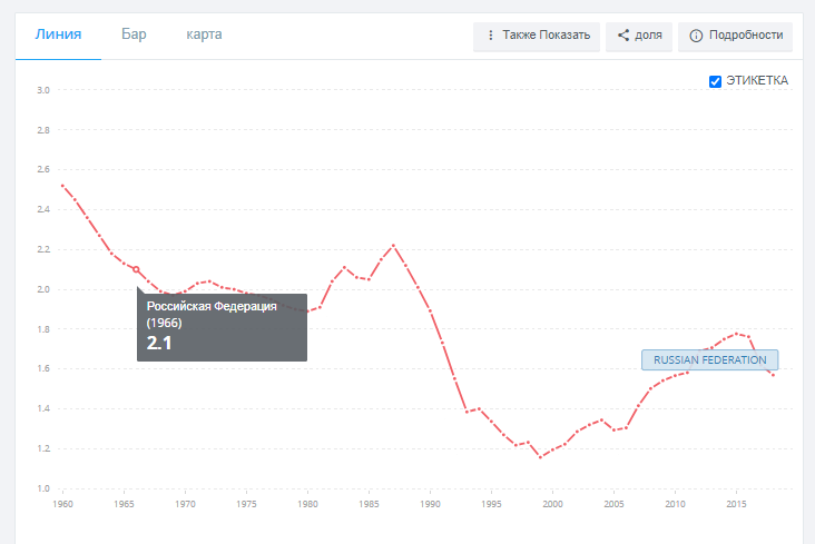 С середины 60-х СКР упал ниже воспроизводства. Маленький смешной горбик — Горбачёвская антиалкогольная компания 85-87, когда единственный раз в 87 году коэффициент вырос больше 2.2 а потом продолжил падение. Обратите внимание, линия падения практический гладкая с 87 по 93 годы. При клятых капиталистах падение стабилизировалось, сменившись попытками неуверенного роста. Но чтобы это повлияло на численность населения рост должен быть не на десятые а в разы, что является крайне нетривиальной задачей.