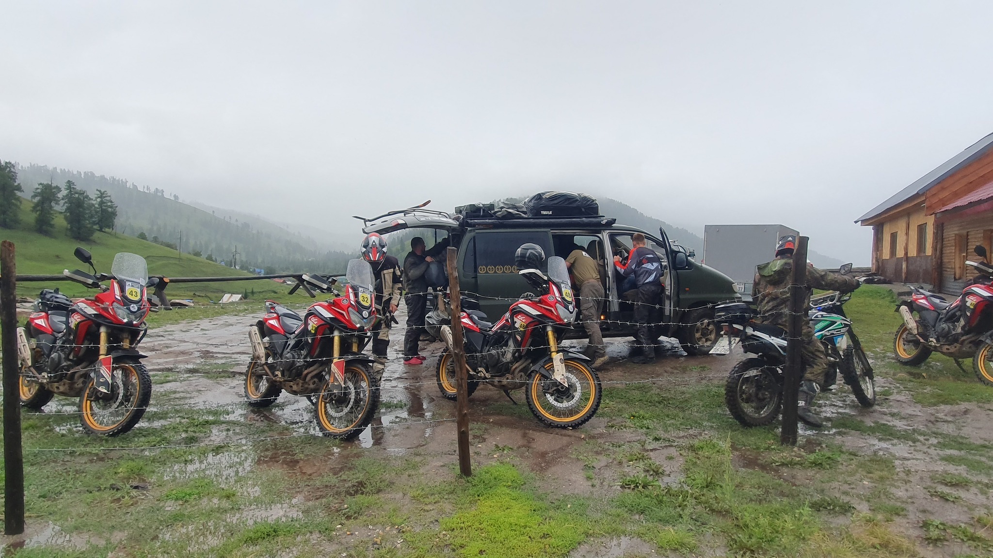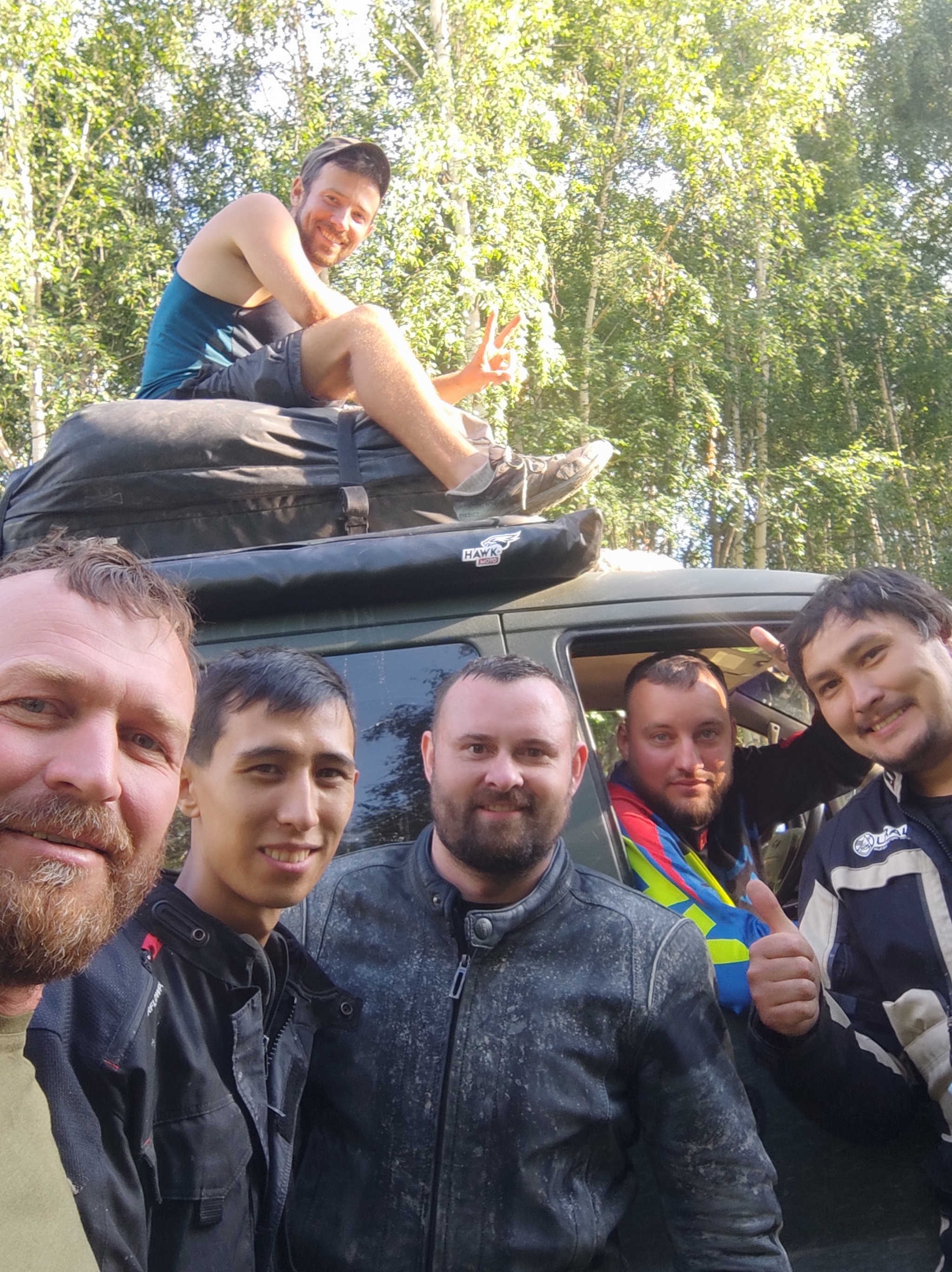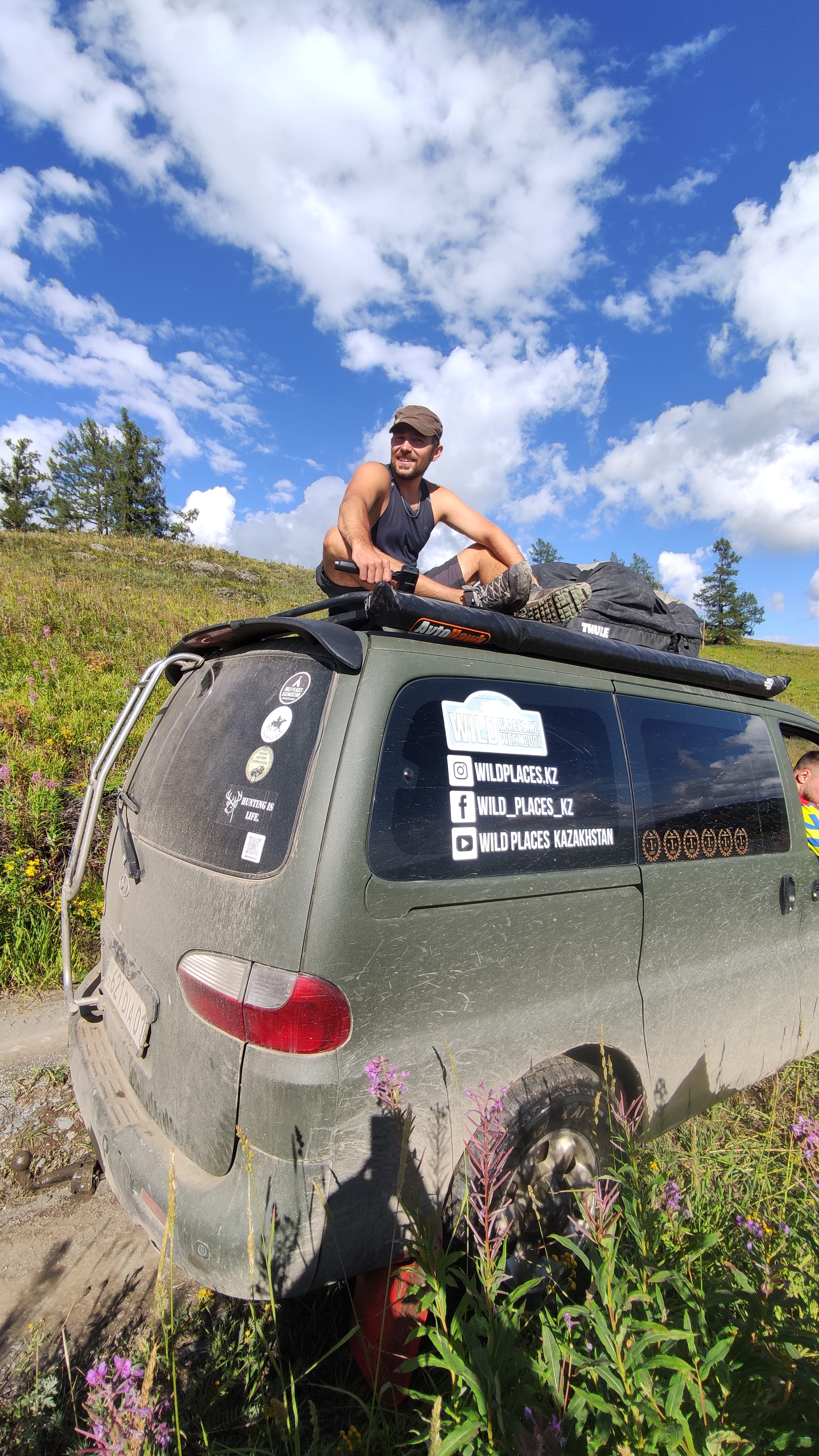 Немного не доходя ещё одного перевала, они меня, наконец, и нагнали. Места в их машине поддержки не было и Денис (организатор тура) посадил меня на крышу. С таким кайфом я проехался верхом! 😂