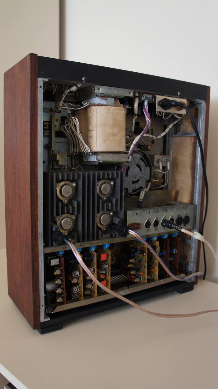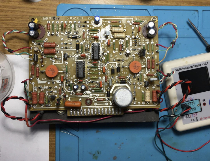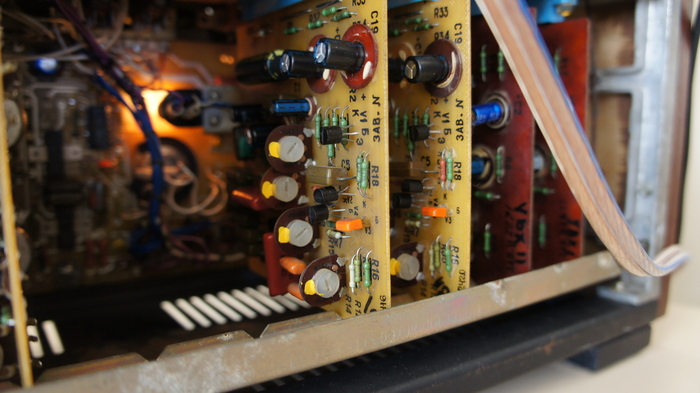 Короче, поела его коррозия и прочая неживая моль. Как обычно, начал с полного разбора на атомы и помойке, ой - отмывке:) Затем заменил высохшие электролитические конденсаторы (их Имхотэб видимо посещал по поводу утраченных ритуальных сосудов, ибо емкость некоторых была доли нанофарад вместо микрофарад), шутка ли, эл. кондеров здесь под свящённую сотню! После 3х томных вечеров, дело было сделано! Вот они новые блестящие китайские бочонки на старых советских платах: