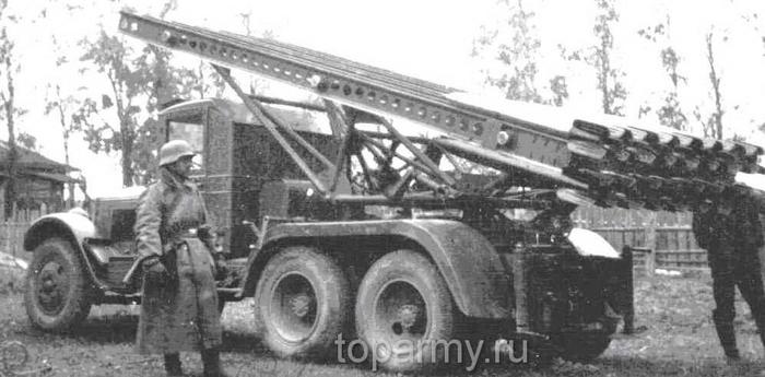 К снаряду разработана самоходная многозарядная пусковая установка. Первый ее вариант - МУ-1 на базе грузового автомобиля ЗИС-5 - имел 24 направляющих, установленных на специальной раме в поперечном положении по отношению к продольной оси автомобиля. Ее конструкция позволила производить пуск реактивных снарядов только перпендикулярно продольной оси автомашины, причем струи горячих газов повреждали элементы установки и корпус ЗИС-5. Не обеспечивалась также безопасность при управлении огнем из кабины водителя. Пусковая установка сильно раскачивалась, что ухудшало кучность стрельбы реактивных снарядов. Заряжание пусковой установки с передней части направляющих производить было неудобно и требовало много времени. Автомашина ЗИС-5 имела ограниченную проходимость.
