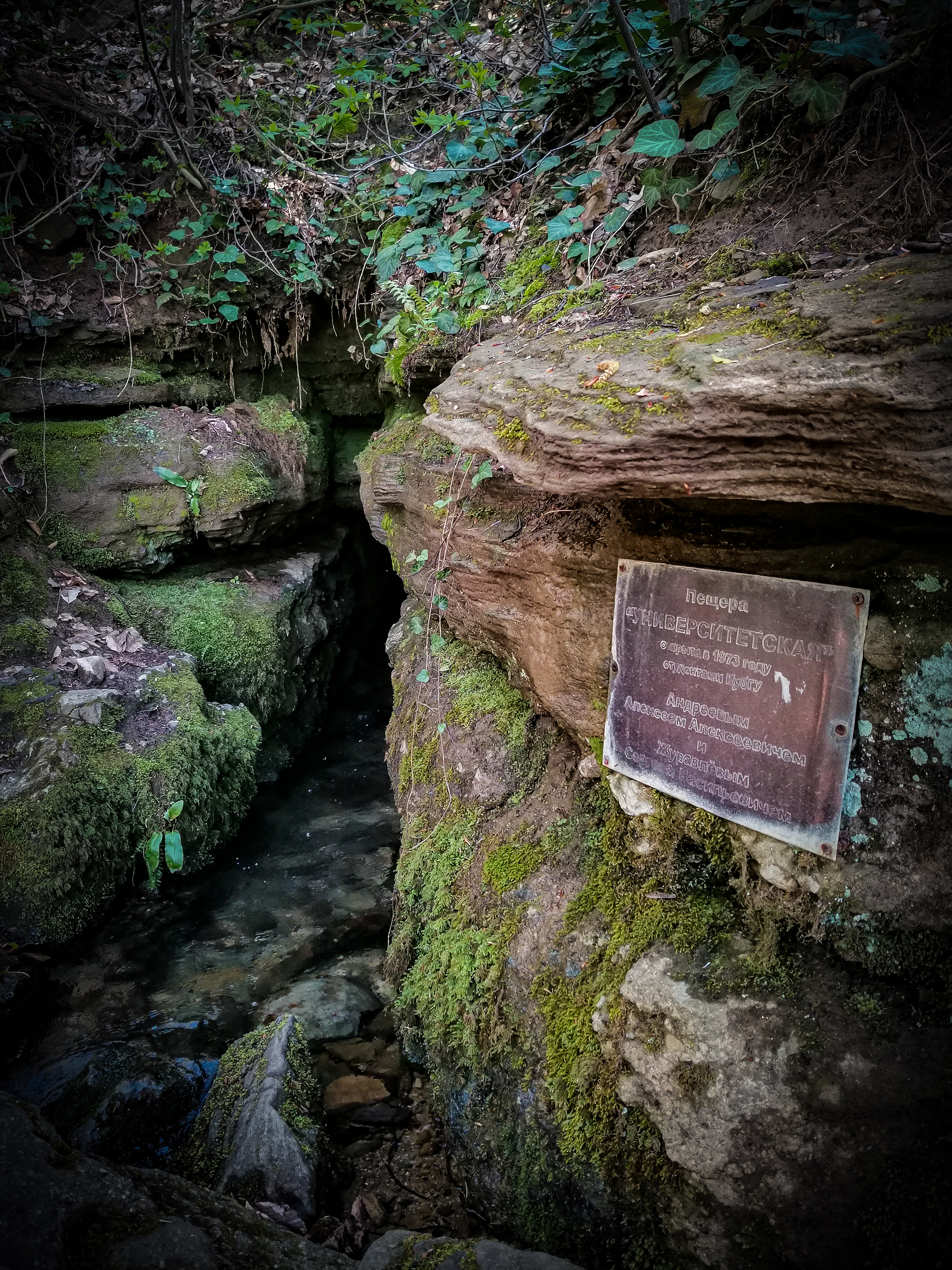 Короткий, но достаточно крутой подъем и вуаля, естественное карстовое образование. Пещера Университетская. Внутрь не полез ибо вода высокая, вода холодная,снаряги ни какой, фонарь и тот только на тапке. Да и времени уже не было.