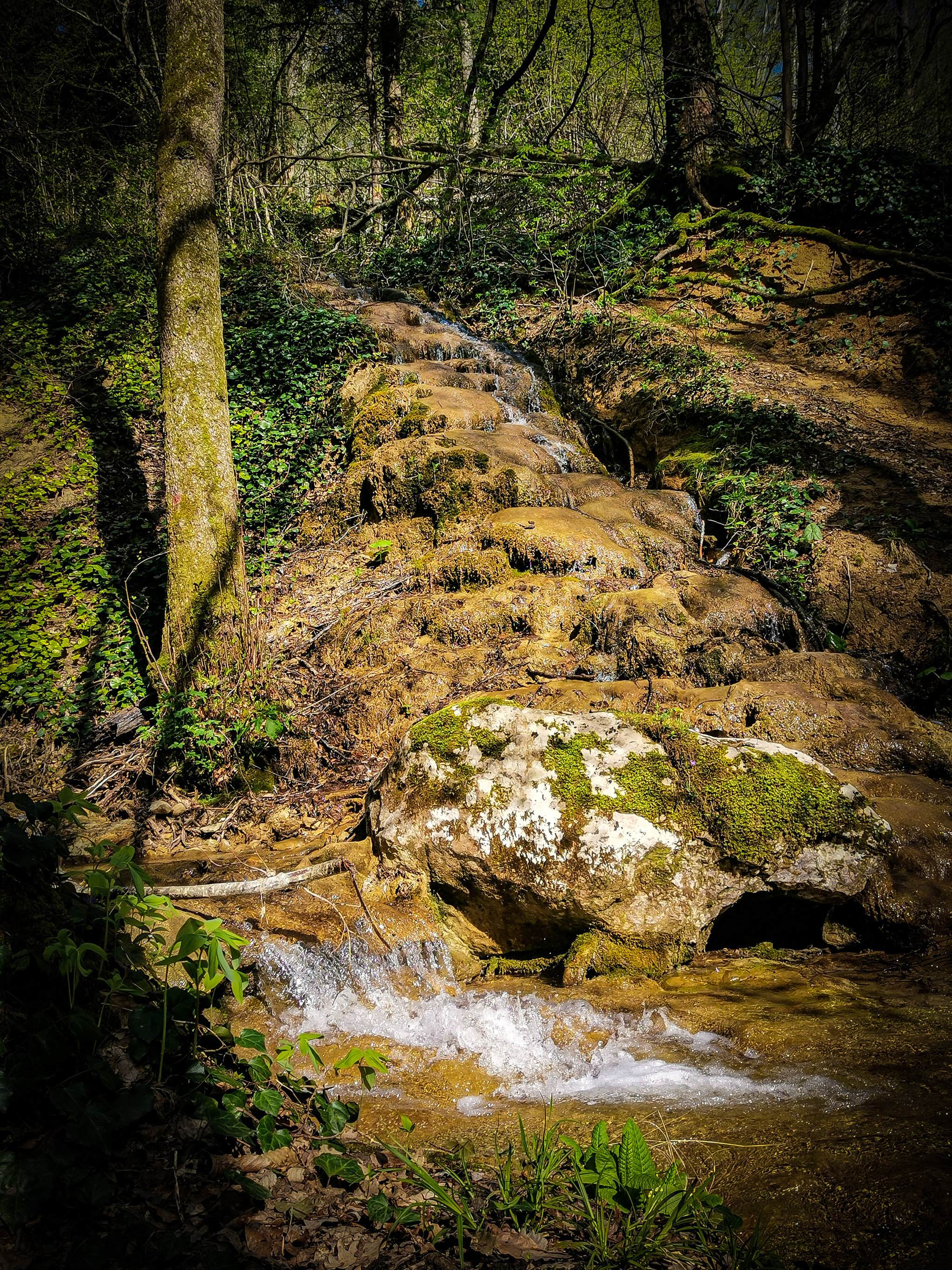 Ручей каскадом спускается по естественным ступеням, как раз он нас и приведет к пещере.