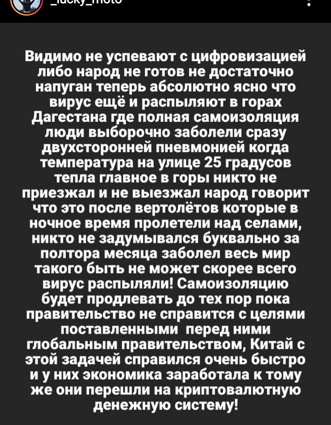 KotikOsik Кавказская легенда 5 лет назад Высоко-высоко в горах, жила маленькая птичка. Но прилетели боевые вертолёты и распылили вирус.Пптичку жалко! [моё] Вирус Маразм Дезинформация Ещё 0