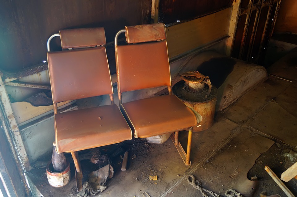 В салоне — немногим лучше; зато сохранилась пара сидений для образца и оригинальная дерматиновая обивка на потолке, которая будет воссоздаваться.