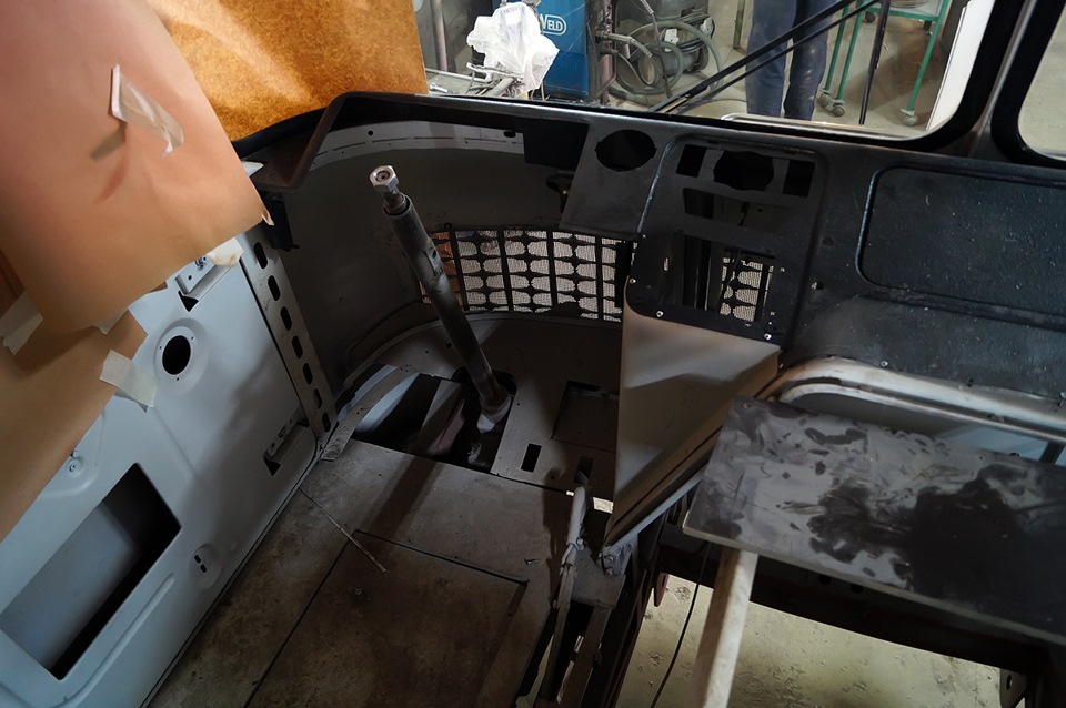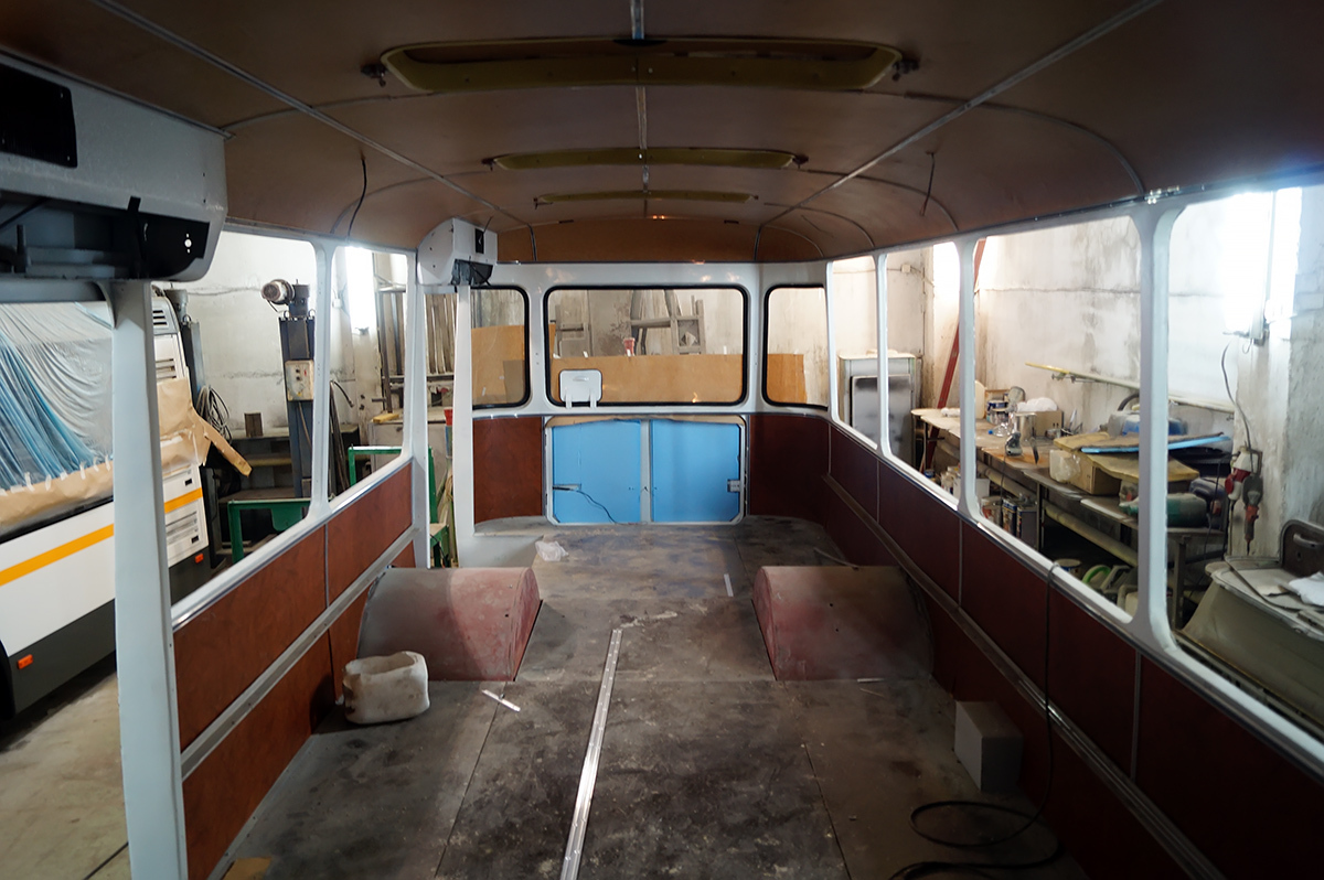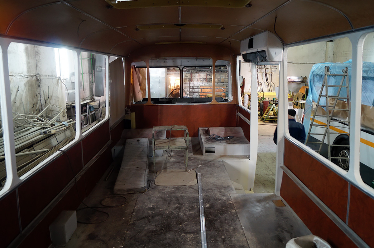 Салон уже заканчивали обшивать по новой; в работе — сиденья, остекление, двери.