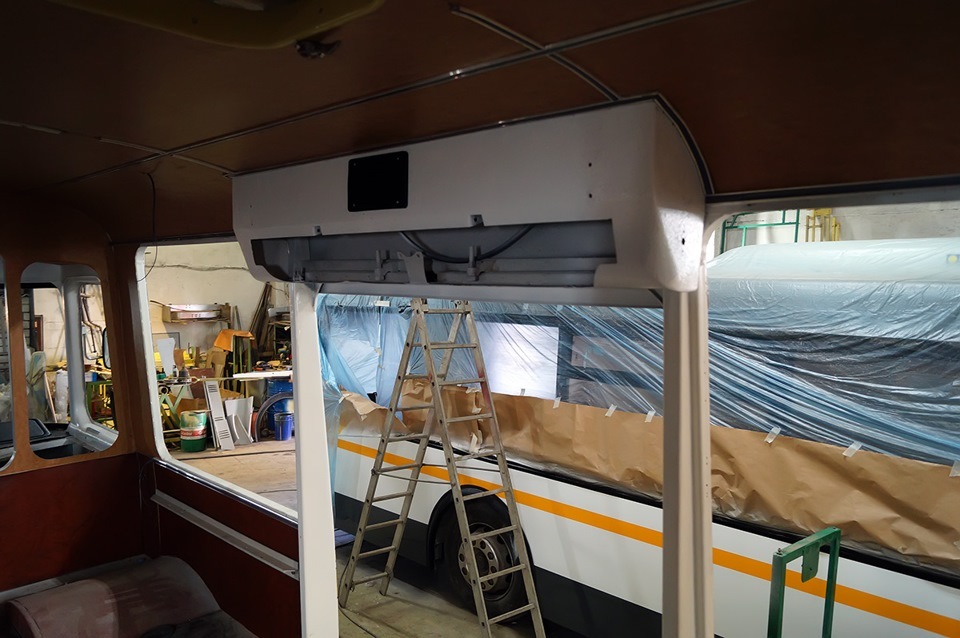 Сейчас в завершающей стадии находятся работы по кузову. В будущем — задачи более сложные, и, увы, довольно небюджетные: автобус хотят и будут ставить на ход! Для этого уже куплен двигатель ЗИЛ-130 (пока без навесного оборудования), а в целом — потребуется скомплектовать трансмиссию (здесь гидромеханический "автомат" львовского производства, ЛАЗ-695Ж2, как на 677, но с другими карданами), построить с нуля пневмосистему (на неё завязаны подвеска, тормоза и вообще всё-всё-всё), и проложить всю электропроводку (сейчас мастера делают под неё заделы под потолком).