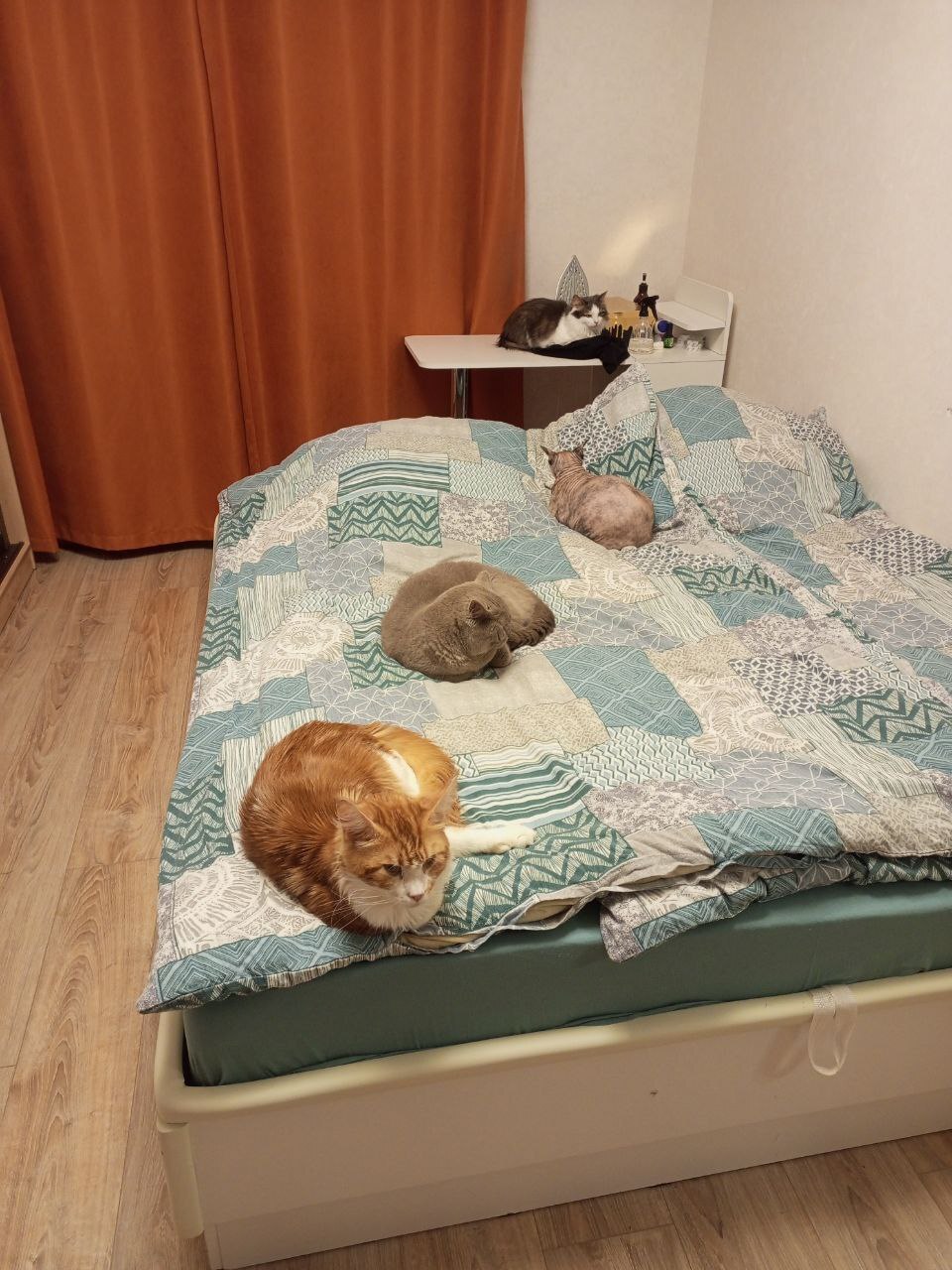 В целом, котаны относятся друг к другу хорошо. Правда, как истинный (хоть и кастрированный) самец, Парпол пытается подкатить к кошкам. За это его нещадно гоняют по квартире. Но в этом есть свои плюсы - Хтоня (лысый корниш) схуднула от такого фитнеса. Немного, но пузень уже не натянут как у клеща. Аппетит у всех четверых хороший, в туалет ходят исправно. Пока никаких признаков болезни нет. Тьфу-тьфу-тьфу.