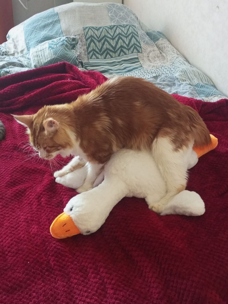 Раз коту нужен кошкозаменитель, то вспомнили про игрушки в виде длинной котоколбасы с лапками. Недавно только видели. Но, в результате мы купили... гуся. Потому что "Воруй-убивай-далее по списку".