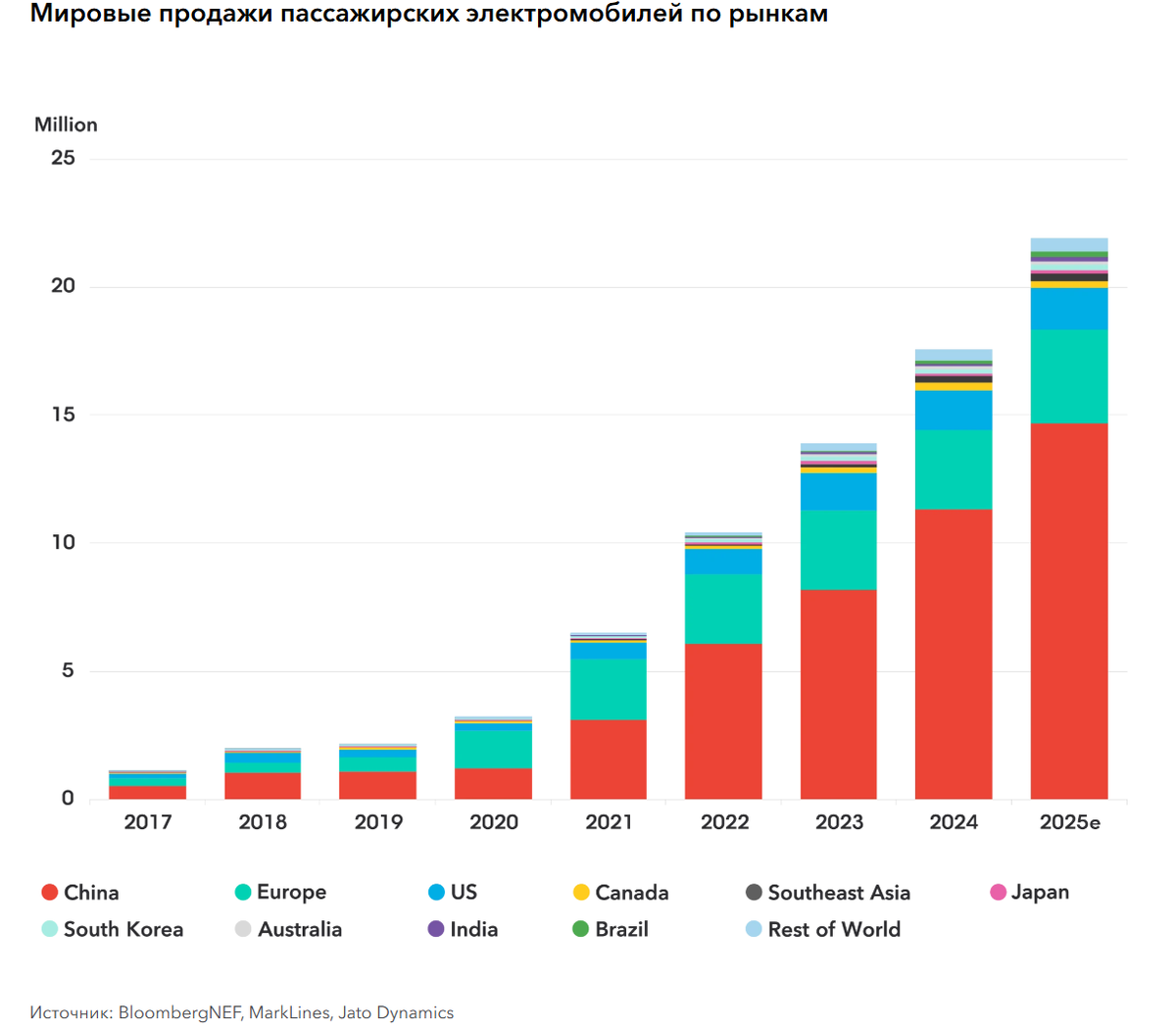 Электромобили продолжают набирать темпы продаж по всему миру. Мировой флагман электромобилестроения BYD продолжает раскурочивать маховик производства не только в Китае но и в Европе. Ежегодный прогноз BloombergNEF говорит о том что продажи электромобилей в 2025 году установят новый мировой рекорд и достигнут 22 миллионов + 25% к прошлому году.