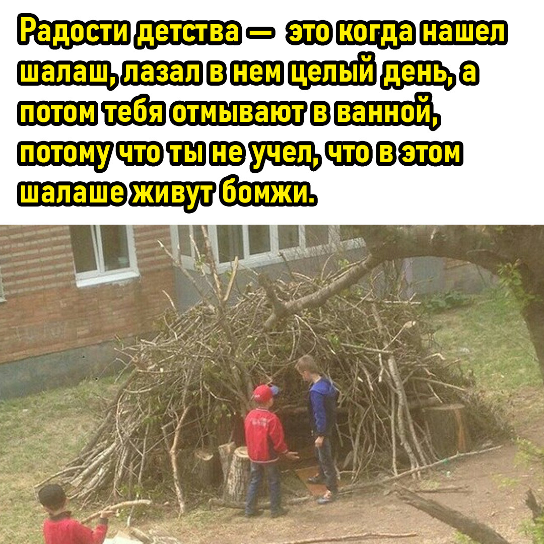 14 ValaSurov Юмор для всех и каждого Каждый шалаш это база 6 месяцев назад Дети — это продолжение наших мечт [моё] Юмор Картинка с текстом Детство Шалаш Бомж Родители и дети 3 2 Ещё 0