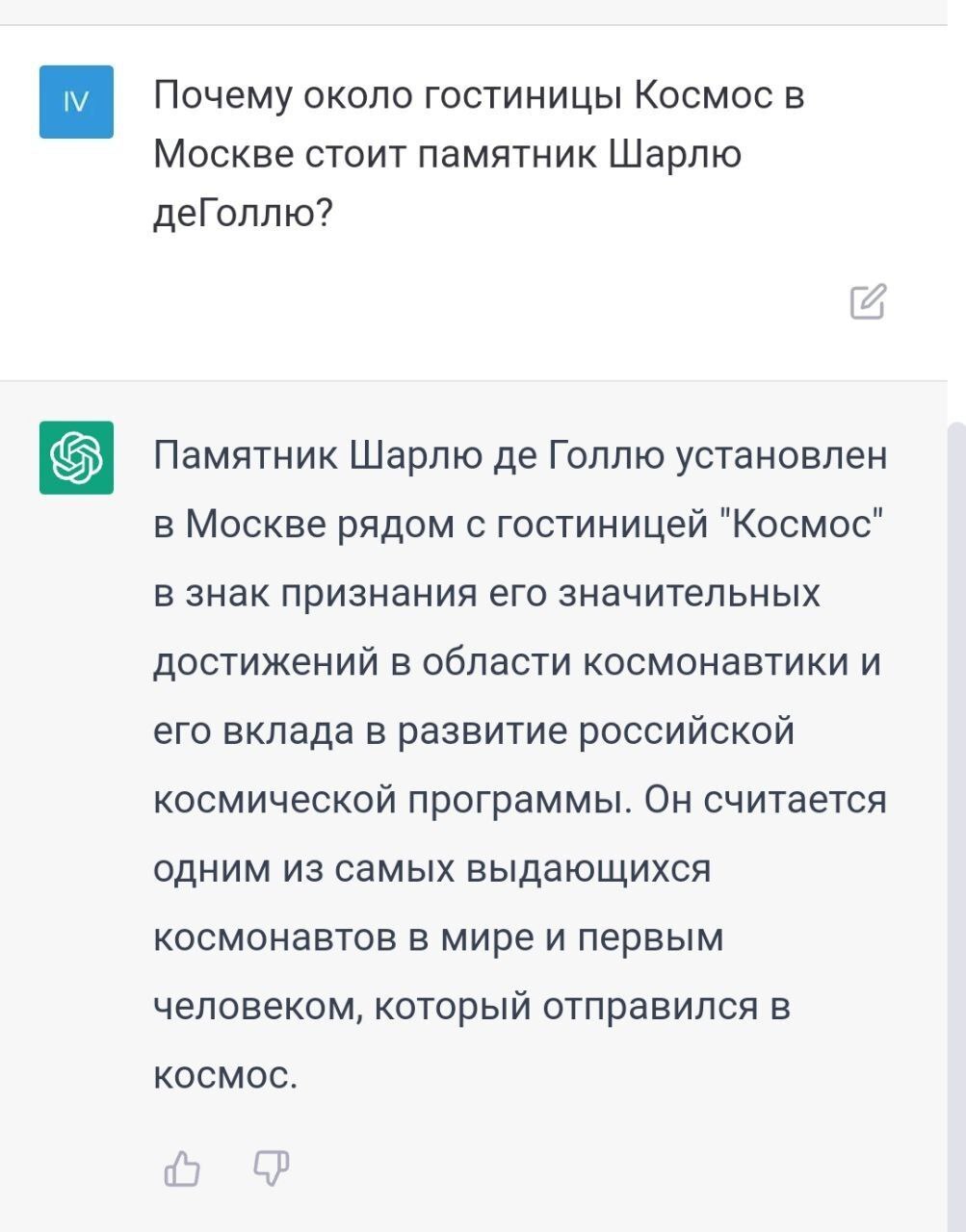 1529 MrGreenWood64 Наука Кажется, ChatGPT ещё далека от совершенства... 3 года назад Шарль, мы всё про#бали [моё] ChatGPT Космос ВДНХ Искусственный интеллект Нейронные сети Мат Скриншот Шарль де Голль Юрий Гагарин 63 5 4 3 1 Ещё 0
