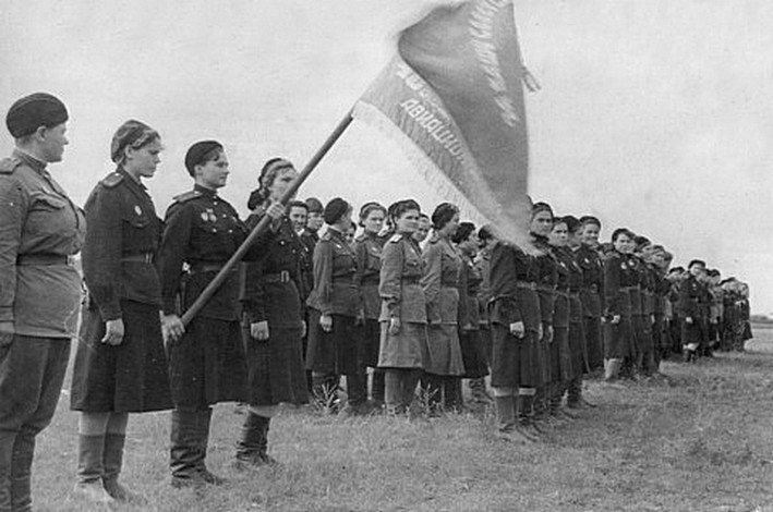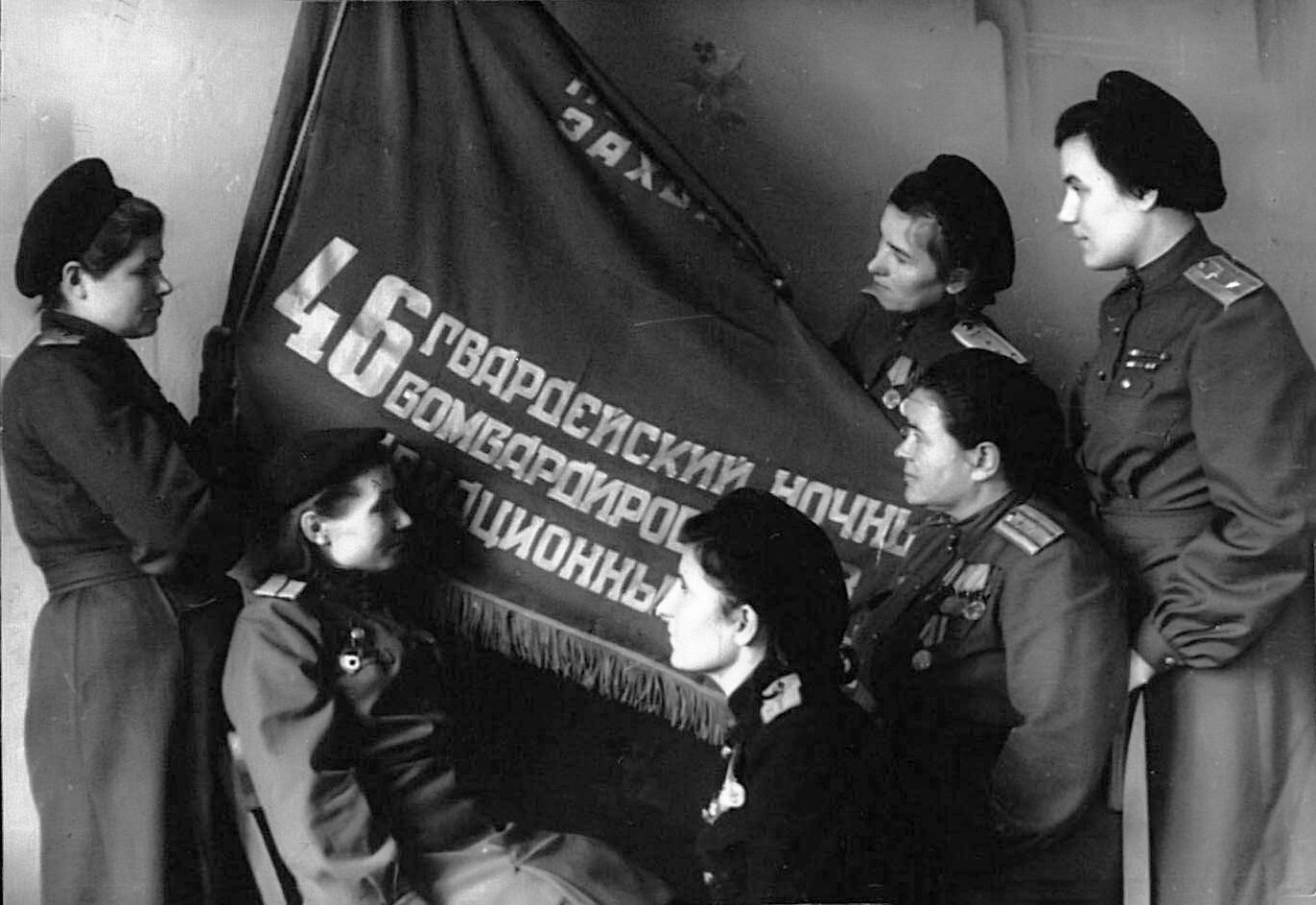Вручение Гвардейского знамени 46-му Гвардейскому Таманскому Краснознаменному ордена Суворова III степени ночному бомбардировочному авиационному полку. Знамя в руках Натальи Меклин. 1943