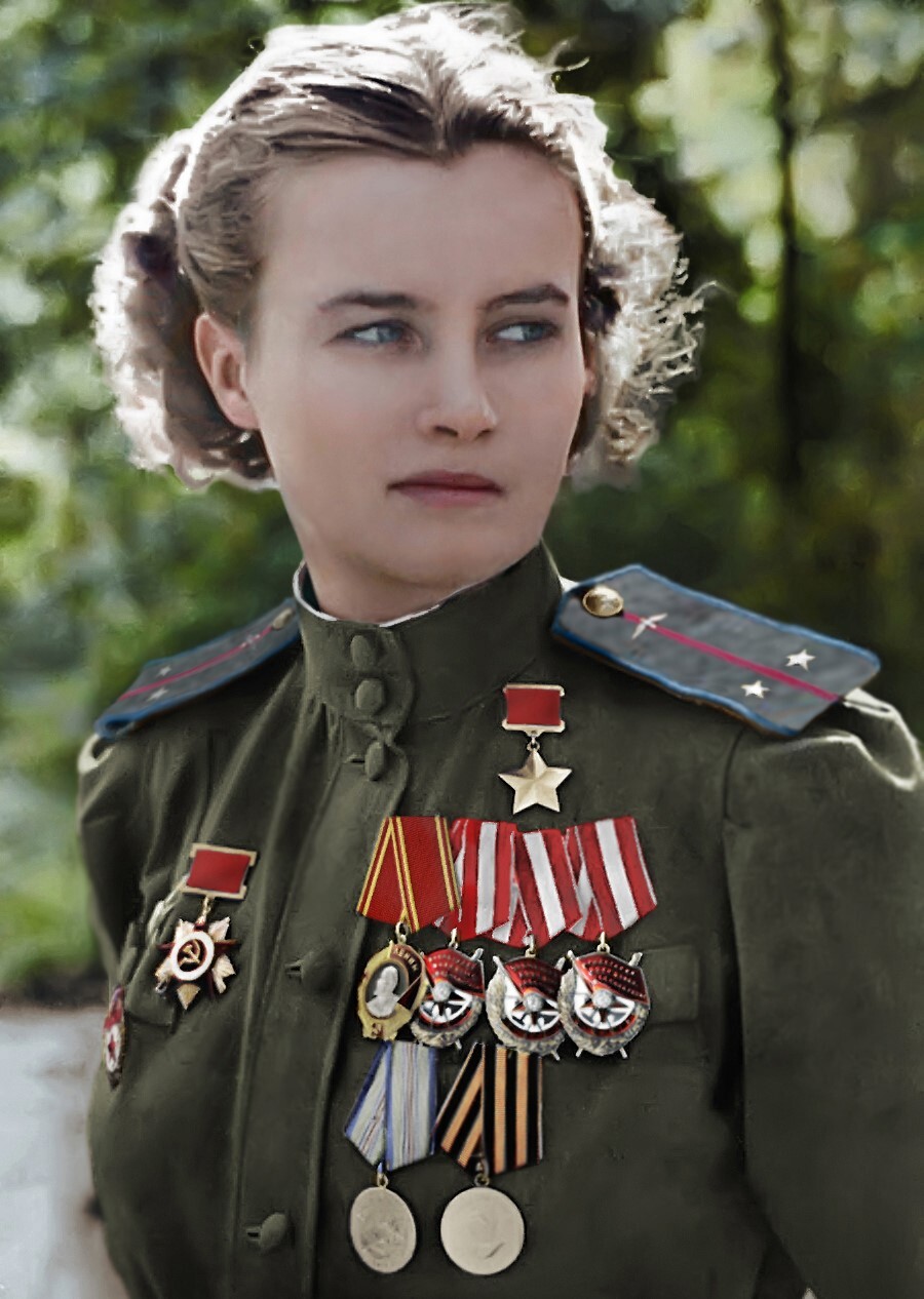 Старший летчик 46-го гвардейского ночного бомбардировочного авиационного полка 325-й ночной бомбардировочной авиационной дивизии 4-й воздушной армии 2-го Белорусского фронта гвардии лейтенант Наталья Меклин, 1945 год (колоризация)