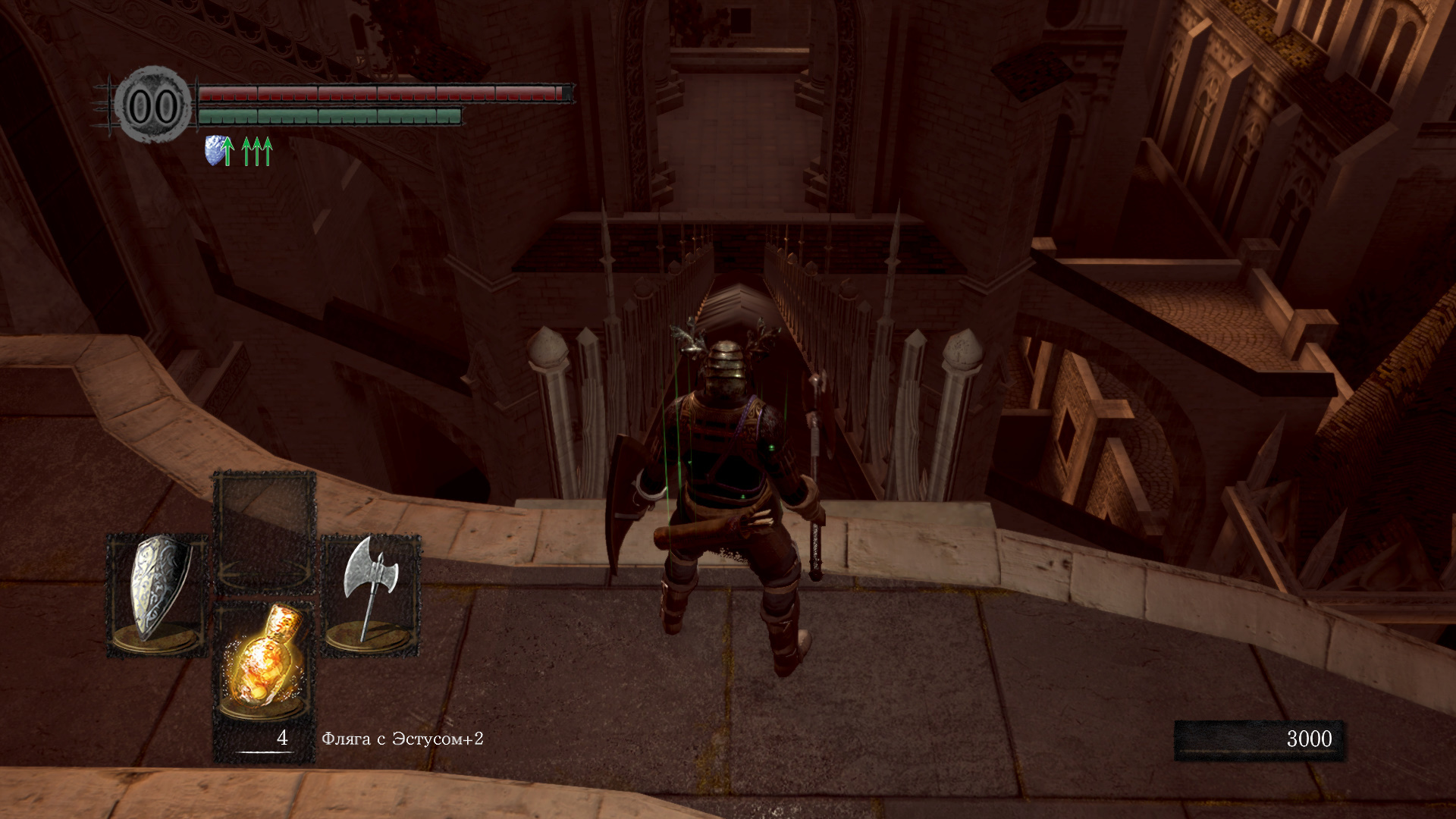 В чём соль всей ситуации: мне нужно пробежать по крыше здания (путь указан зелёной стрелкой). Дорога узкая, перил не имеется, любой случайный шаг за край крыши и обратно к костру. О костре я расскажу чуть позже, а пока мало же узкого пути без права на ошибку, так здесь стоят два рыцаря с луками. Одно попадание по вам и вы так же летите с крыши. Но есть же щит? Да, он помогает, и стамину полностью они не могут выбить. Только, если бы данные рыцари были только лучниками, при приближении к ним они благополучно убирают луки и достают мечи. А, чтобы вы понимали данные рыцари огромная боль в заднем проходе, особенно для новичка, что только учится играть в данный жанр игр. Так же не забывайте об узком участке с которого вам нельзя свалиться и рыцарь, что идёт на вас и убьёт с пары тычек. Остаётся надеяться только на то, что он свалится и мне всё же повезло, он свалился и я прошёл к следующему костру.
