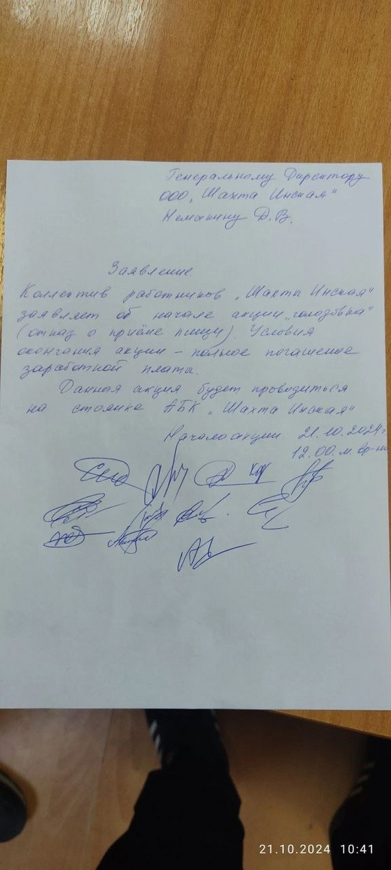 В распоряжении журналистов оказались фотографии коллективного заявления работников, в котором те сообщают о начале голодовки.