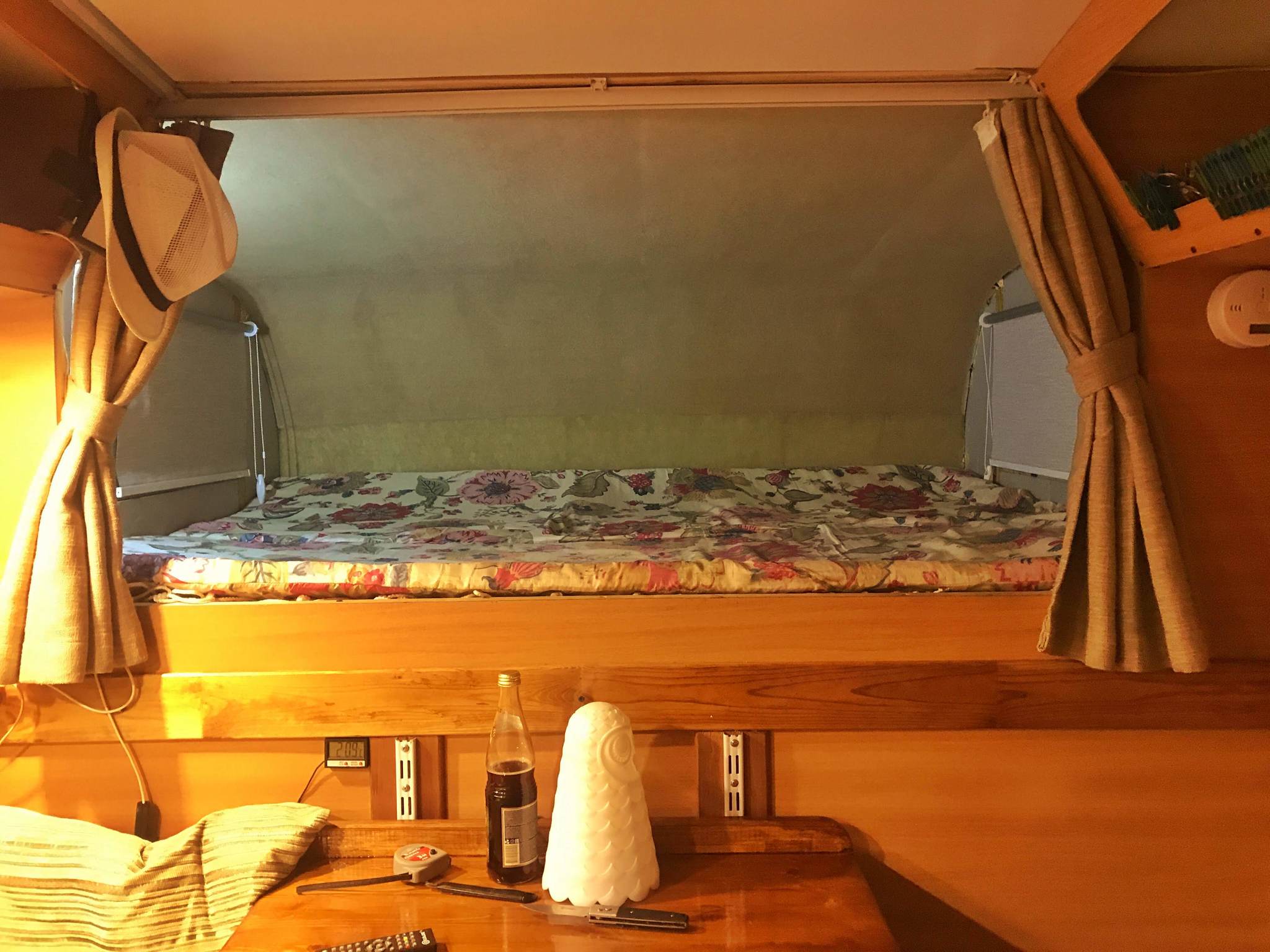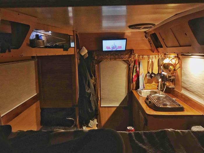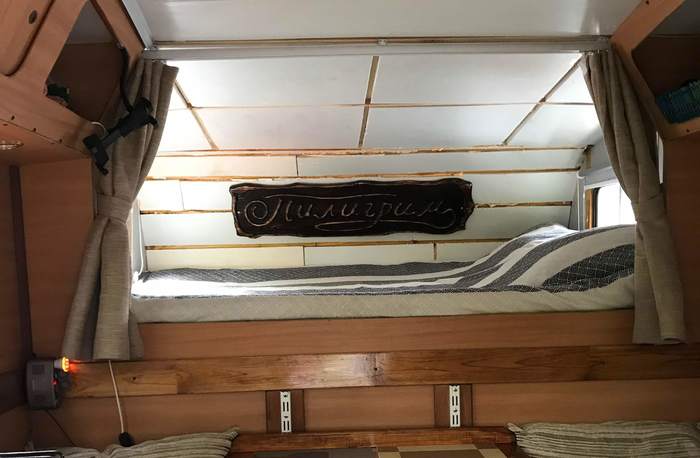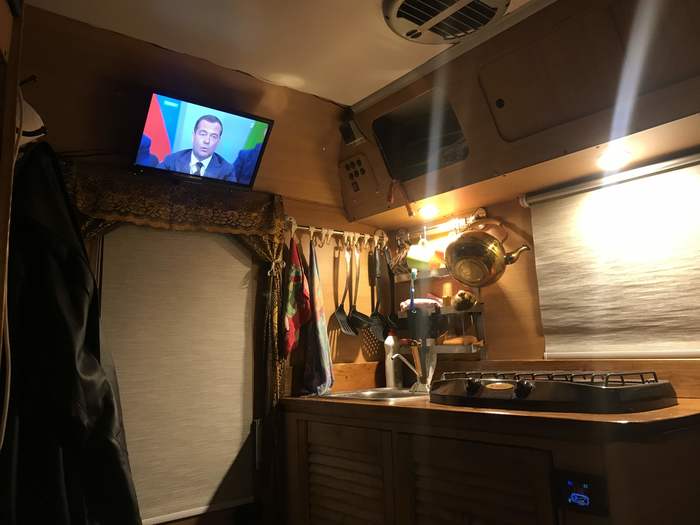 Цифровая приставка. И телек показывает 30 каналов. И где бы я не был могу смотреть местное ТВ. Или с флешек. Расположил над дверью. И не мешает никому и смотреть можно с любой точки кемпера. Вот вид из алькова.