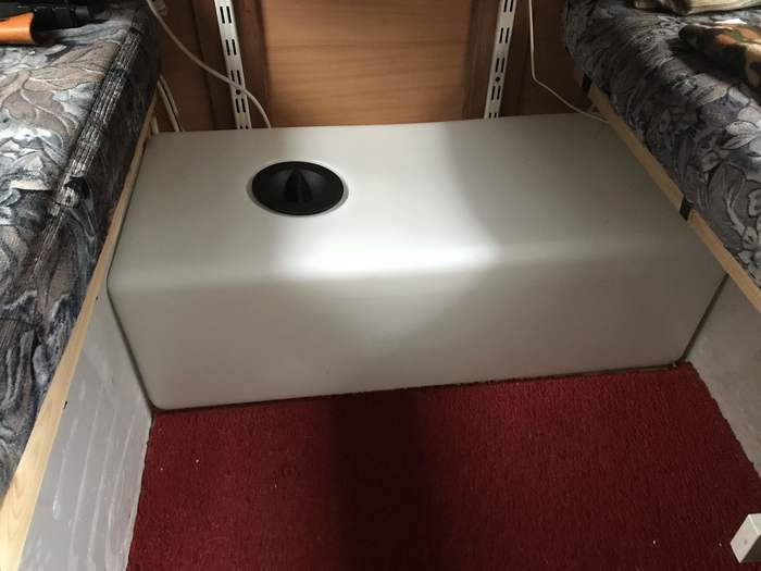 Получилось вполне прилично и в стиле всего кемпера. А заодно новая полка)). Сверху большая пробка для обслуживания и чистки бака. Завивка производится снаружи через заливную горловину. А вот помыть бак раз в неделю изнутри лишним не будет.