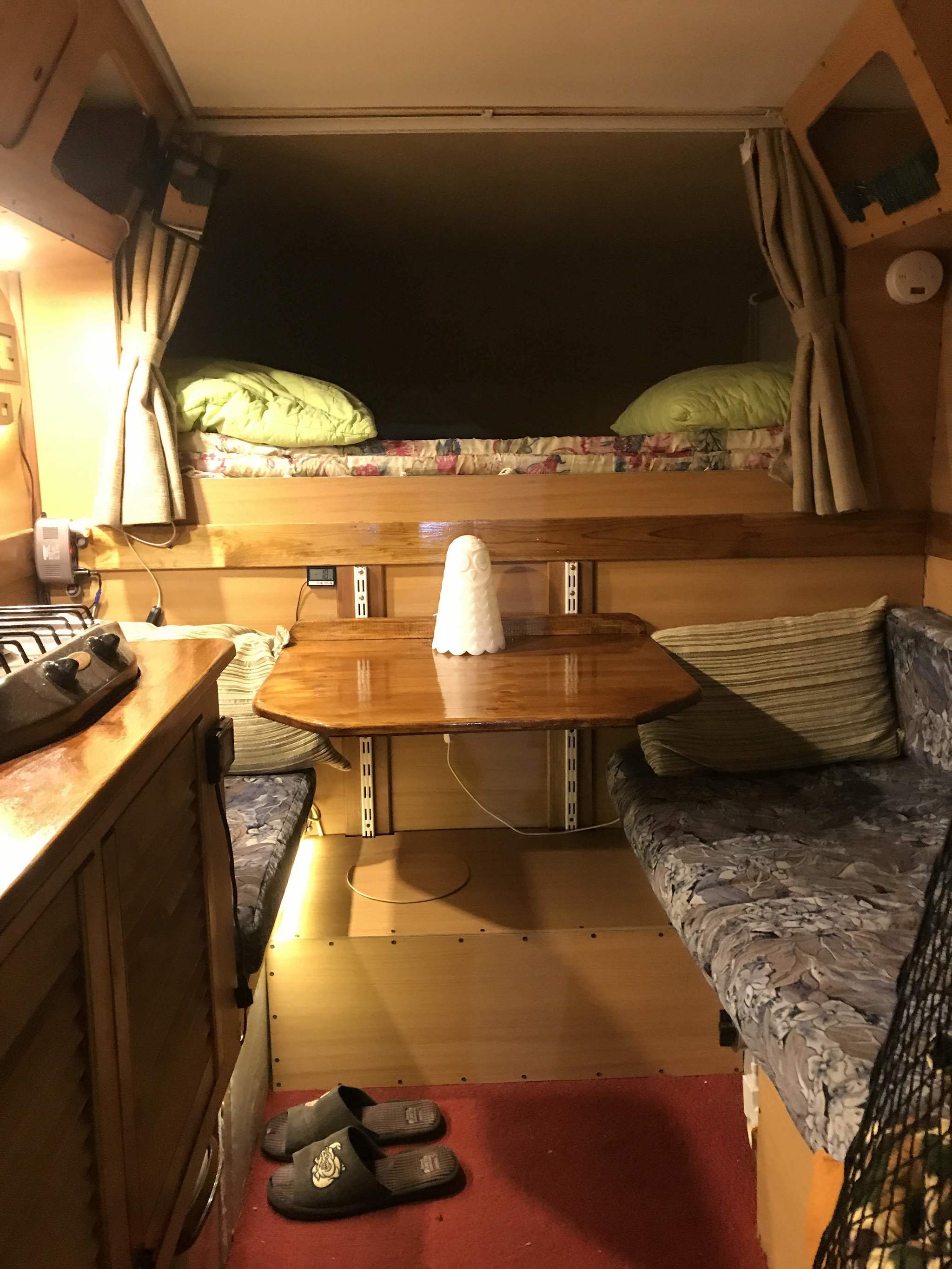 Цифровая приставка. И телек показывает 30 каналов. И где бы я не был могу смотреть местное ТВ. Или с флешек. Расположил над дверью. И не мешает никому и смотреть можно с любой точки кемпера. Вот вид из алькова.