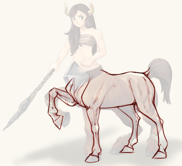 В общем, больше пострадала задняя часть, впереди лошадиное тело ещё более менее. Вообще, мой тебе совет, в дальнейшем для рисования лошадиной части кентавров опирайся прямо на настоящих коней. Смотри фотки, анатомические зарисовки, что-то можно и срисовать, почему бы нет - для начинаний нормально, главное не копировать совсем. Обязательно обращай внимание на расположение конечностей, чтобы на рисунках получалось естественнее. Не все животные могут одинаково пользоваться своими ногами\лапами и т.д.