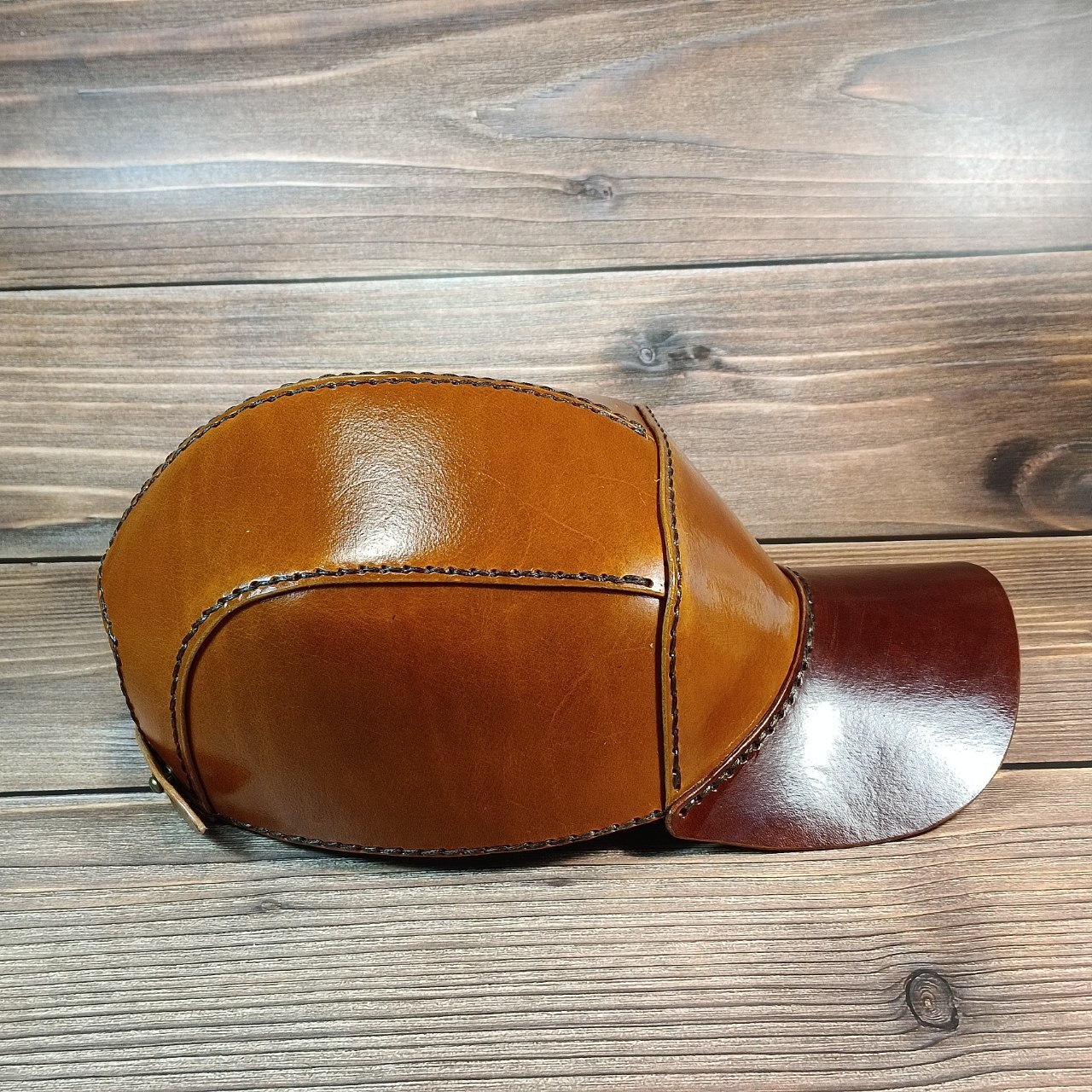 Первый опыт работы с кожей растительного дубления, и её окрасом. Процесс был очень интересным. Впечатления - только положительные. За счет свойств растишки кепка прекрасно держит форму.