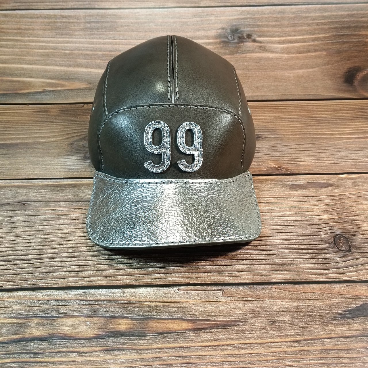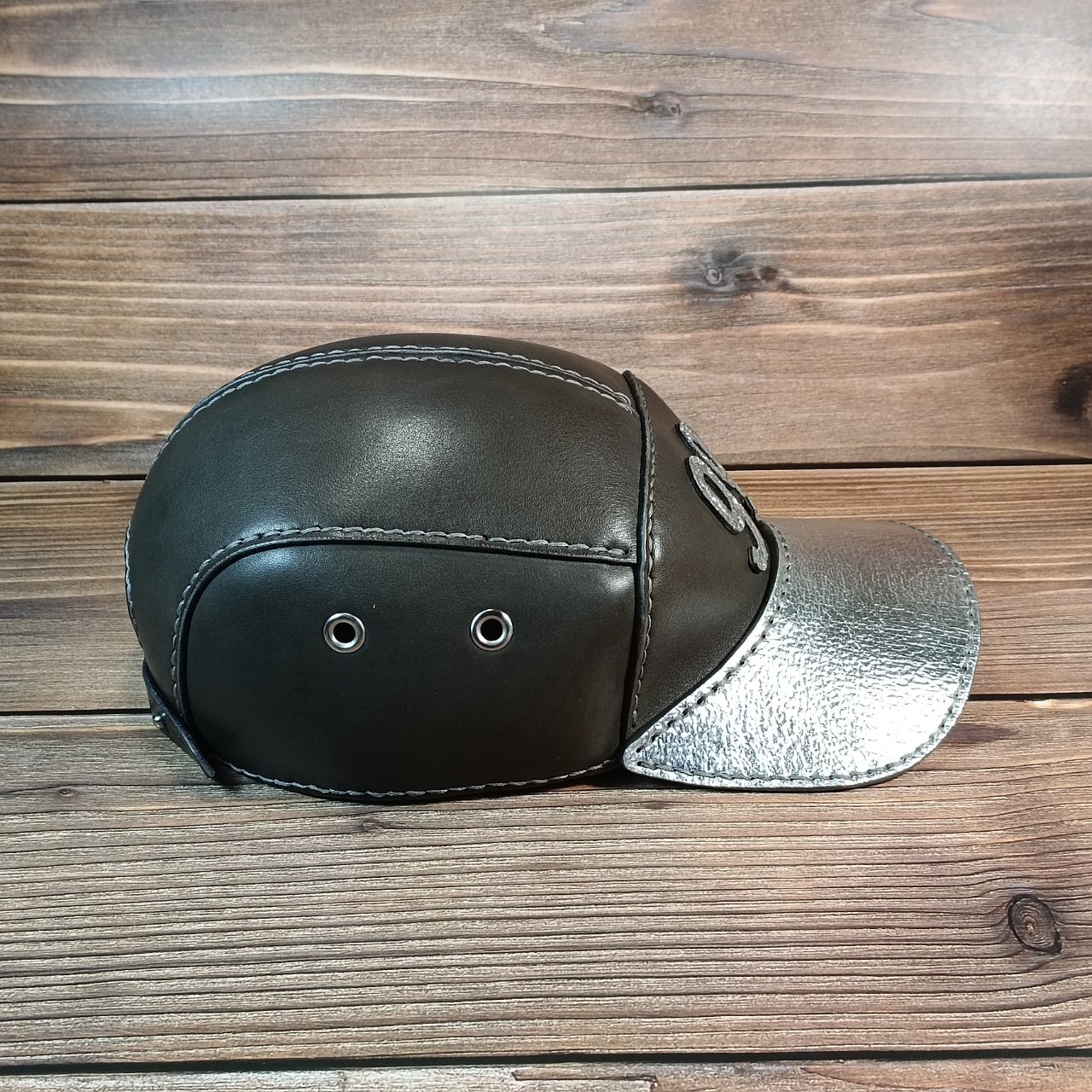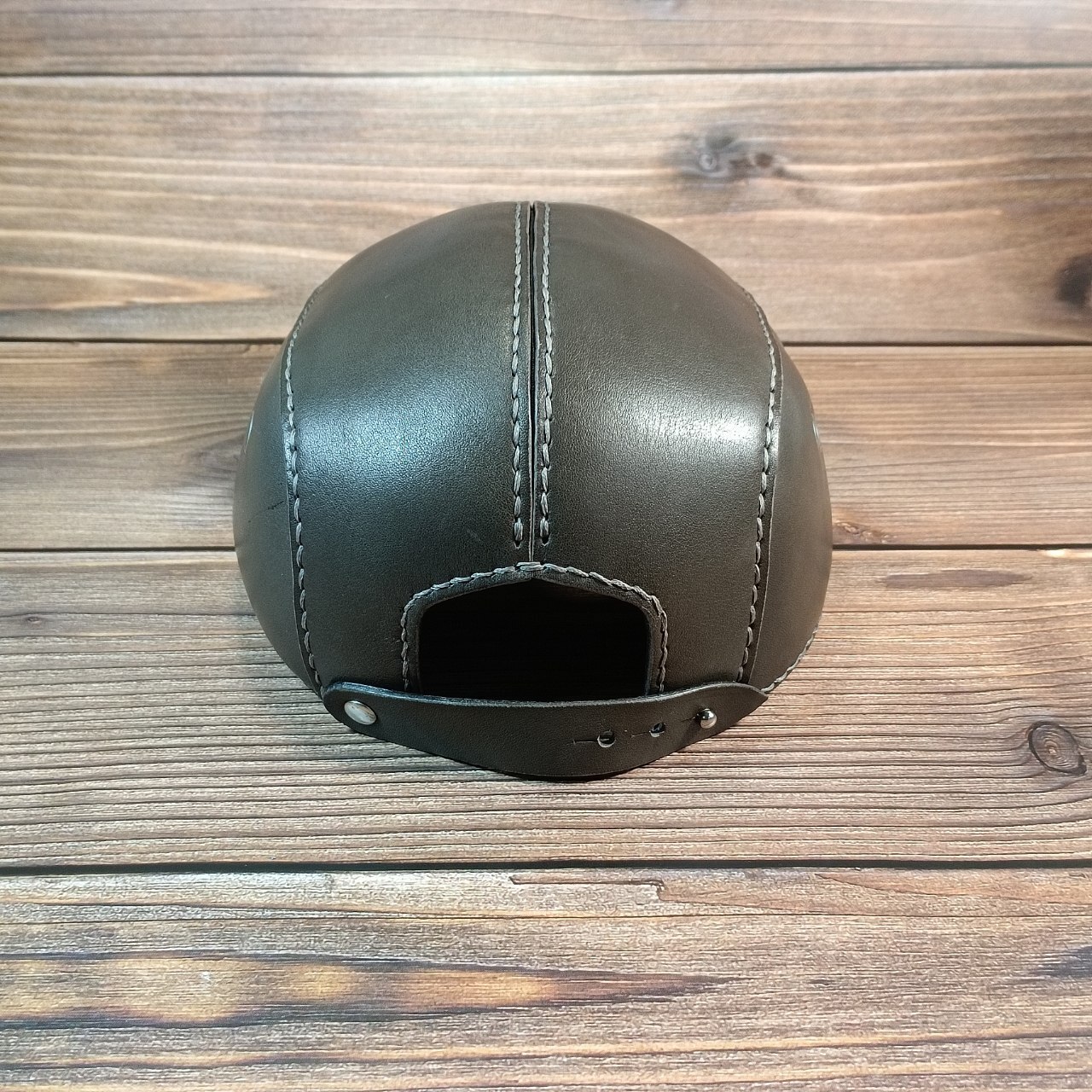 Козырек трехслойный. Кожа с покрытием металлик очень тонкая: 0,5 - 0,6 мм. И мягкая, как ткань. Покупал её у девушки которая продает материалы для пошива кукольной одежы. Между двумя слоями металлика чепрак. Слои склеены на шаблоне с радиусом изгиба 15 см, чтобы за счет напряжения козырек держал форму. Урез козырька покрыт серой краской. Цвет кожи имеет легкие примеси зеленого. На фото это видно. Я смешивал серый (основа) от Malenberg, черный и зеленый. В сером к сожалению есть примеси голубого. Полностью в тон кожи попасть не удалось. Получилось нечто среднее между цветом кожи и цветом ниток. Серая краска оказалась долгосохнущей. Возможно это особенность красок Malenberg, а может быть только этой краски.