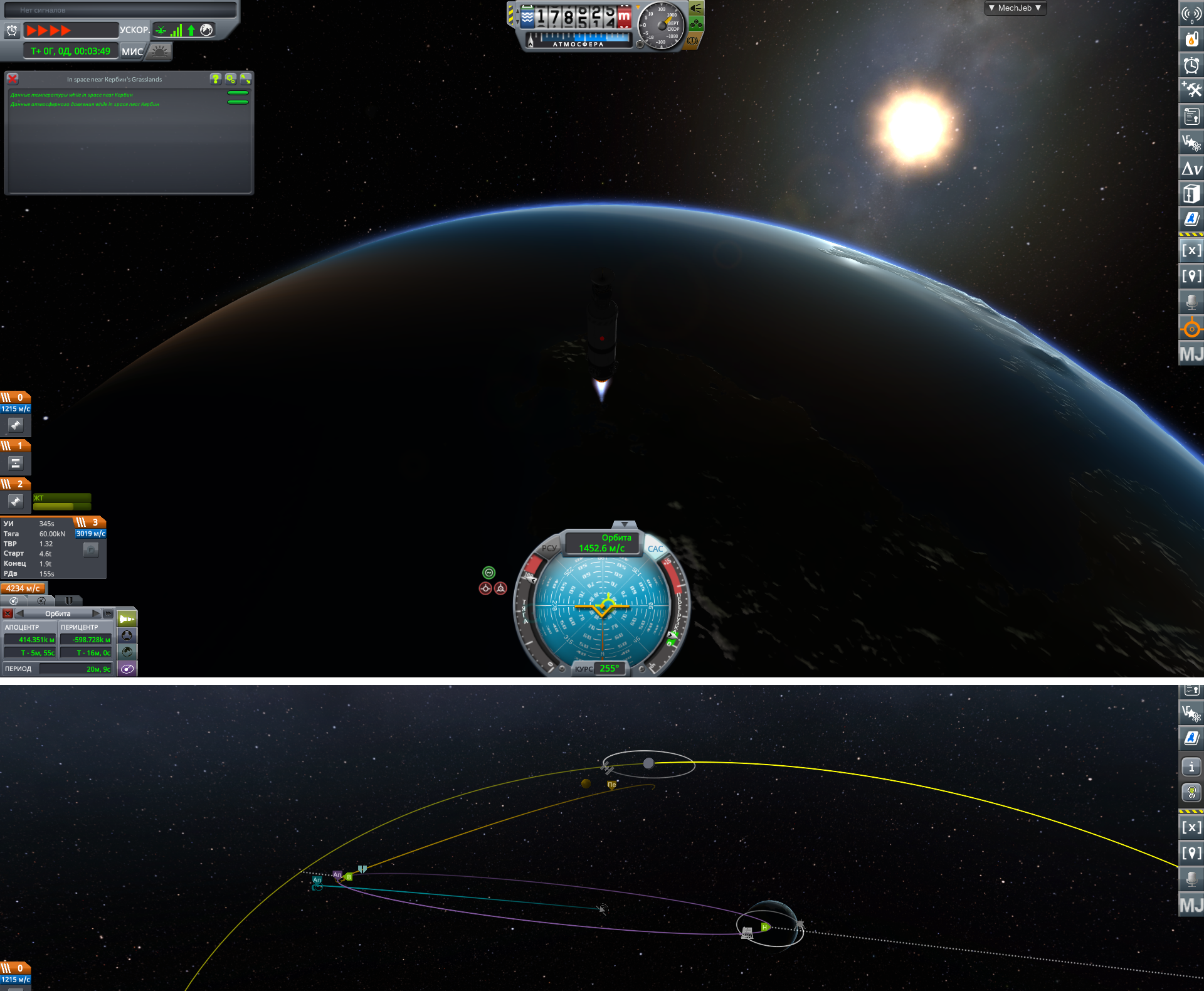 Сам полёт был запланирован на ночь. Для упрощения я не буду выходить на орбиту Кербина, а сразу полечу на перехват Муны (вполне рабочая схема, хоть и не всегда самая оптимальная, но максимально простая). Собственно для не игравших поясню, что если так взлететь и промахнуться мимо луны, что вполне себе запросто то свалишься обратно на кербин, орбитой там и не пахнет. Заходя вперед скажу, что с взаимным расположением я промахнулся, поэтому на орбиту муны залетел не с той стороны, что вызвало проблемы, но об этом позже.