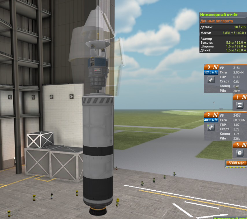 Добавляем сбрасываемый обтекатель, для улучшения аэродинамики весом в жестокие 240 кг (но лучше так, чем тереться деталями о плотные слои) и ступень с актуальным на текущий момент по технологическому дереву двигателю для космических перелётов "Терьер" на 60 кН с уд. импульсом (Вакуум) в 345 единиц. Используем 4.5 тонный бак (на сленге их раньше называли "Карандаш"). На данном этапе главное не пожадничать и не понатыкать баков для улучшения запаса дельта V. 4093 единиц более чем достаточно для ступени, тем более в такой конфигурации, у нас получается положительный ТВР (>1), что не позволит нам свалиться на Кербин (землю), если вдруг накосячим с просчетом других ступеней. Уже не кислые 5.831 Тонны получились.