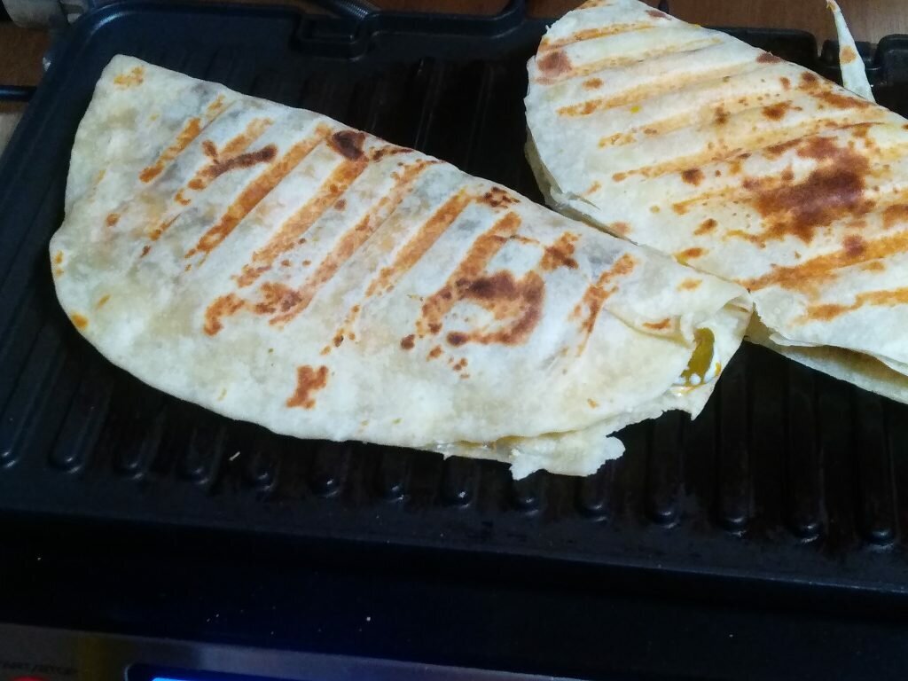 Сверните в кесадилью и обжарьте на гриле.