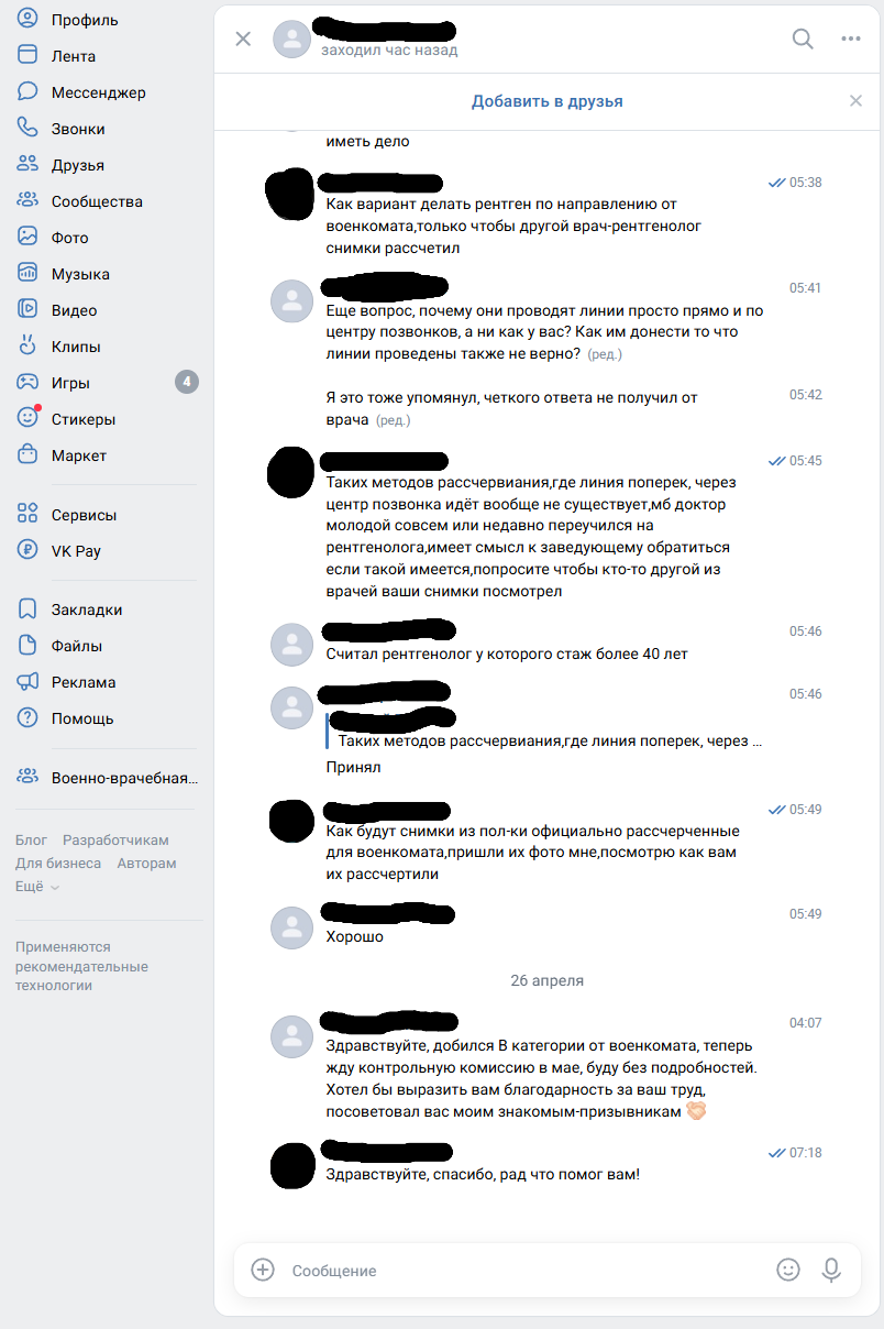 Ко мне обратился призывник с диагнозом: сколиоз грудного отдела позвоночника, он сделал снимки(самообращение) в своей пол-ке, где ему отдали на руки только описание, где фигурировала правосторонняя сколиотическая дуга с углом искривления 15 град-соответствует сколиозу 2 (второй) ст.- категория годности к военной службе по ст.66г- Б4(годен к в/сл с незначительными ограничениями). Переделав снимки в частной клинике в заключении у него был описан больший градус. Рентгенологические снимки с частных клиник военкомат не принимает. Расчертив снимки призывника у меня получились результаты: правосторонний сколиоз грудного отдела позвоночника 3(третьей) ст. по методу Кобба(27 градусов),3(третьей) ст. по Фергюсону(26 град),что соответствует ст. 66 в-В(ограниченно годен к военной службе).В дальнейшем призывник добился переснятия снимков по направлению от военкомата, при повторном расчерчивании-подтвердилась категория годности В(ограниченно годен к в/сл).