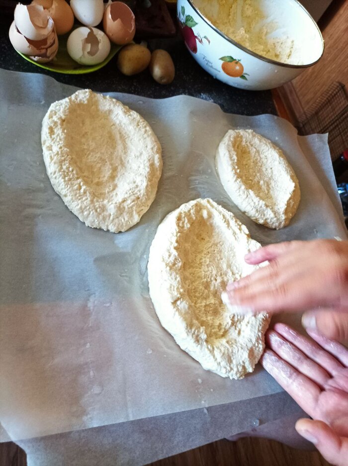 Формируем из него лодочки, руки, чтоб тесто не прилипало, смачиваем водой