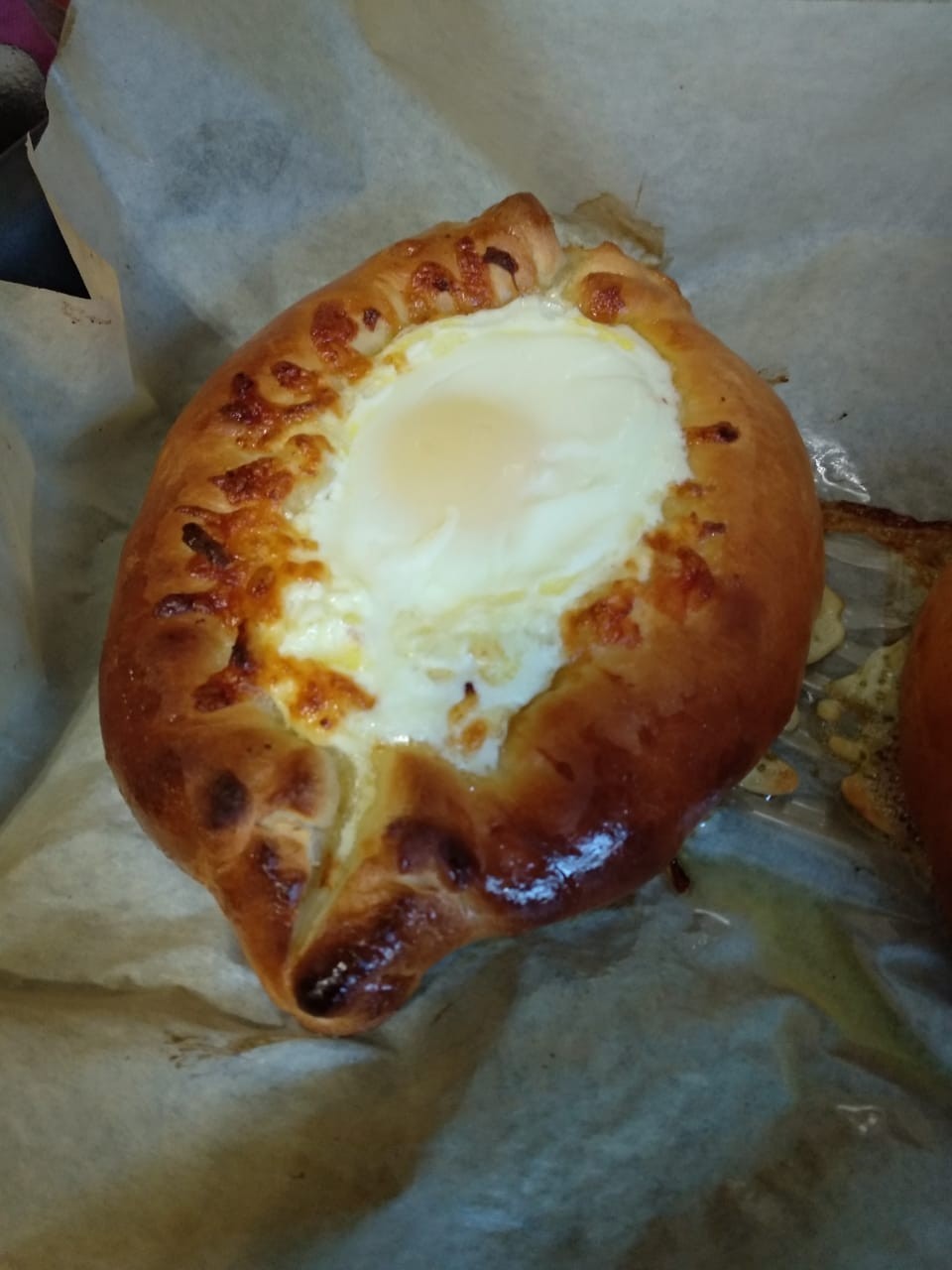 К этому времени духовку разогрели до 220 градусов. Ставим наши хачапури и выпекаем до слегка золотистой корочки. Минут за пять до готовности (слегка золотистый цвет) достаем из духовки. Делаем в центре начинки углубление и вливаем сырое яйцо. Ставим обратно в духовку на несколько минут, пока яйцо не схватится (белок побелеет).