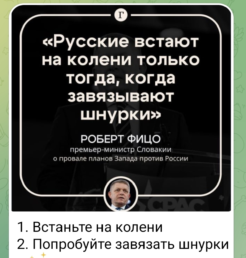 135 graf4ikov Политические мемы Хах, действительно 20 дней назад Источник Telegram (ссылка) Юмор Цитаты Роберт Фицо Скриншот Политика Русские На коленях Шнурки 150 41 13 1 Ещё 0