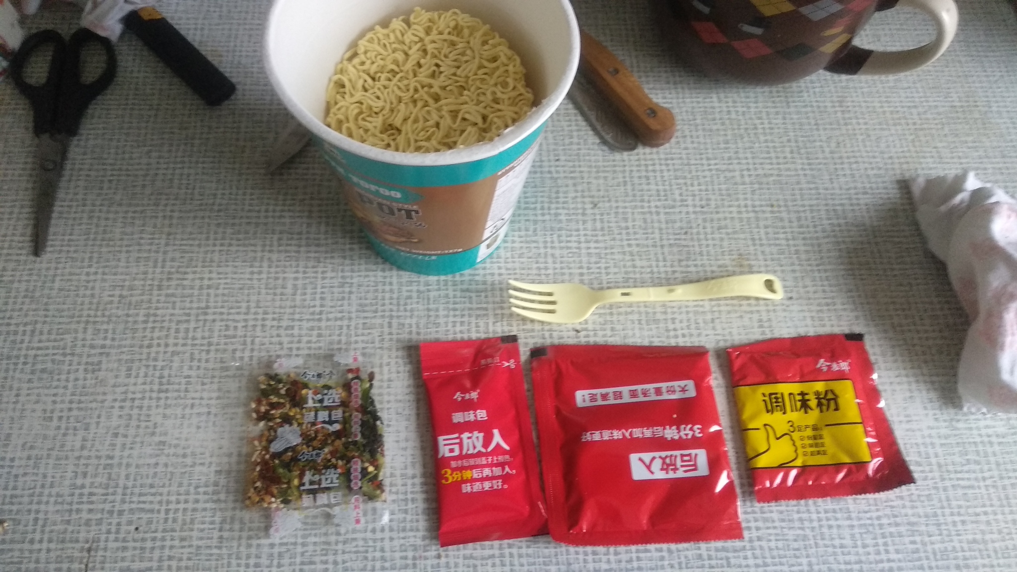 Имеем мы немаленькое ведёрко с лапшой и 4мя пакетиками: овощи, порошок, соус с привкусом кунжута и арахиса, и острое масло.