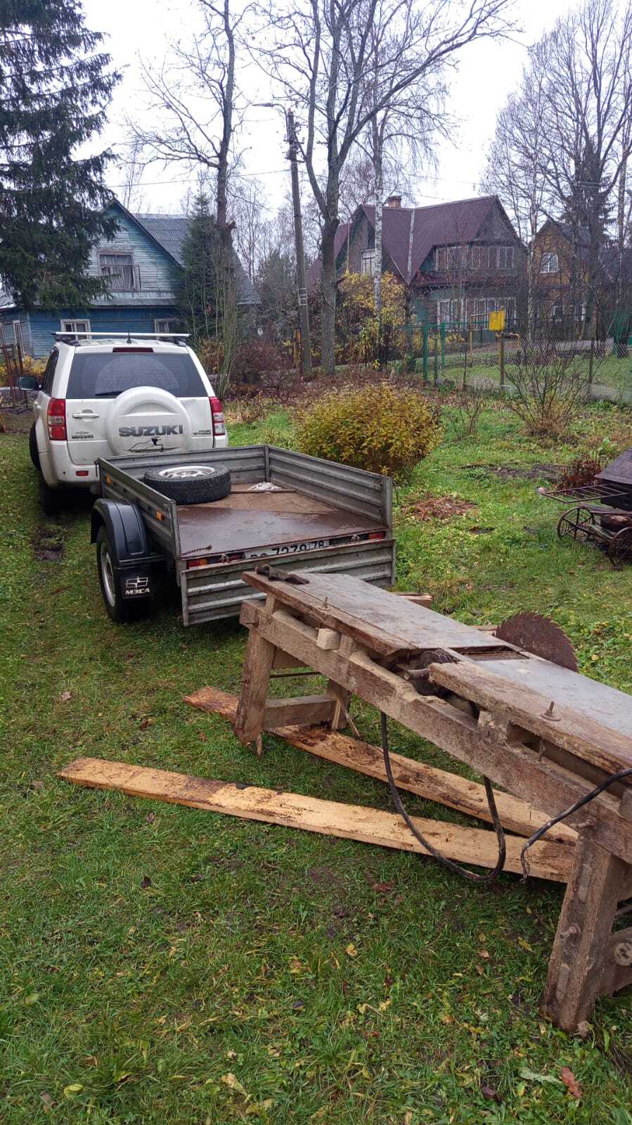 Так вот новый станок был фуговальный + дисковая пила. Станок был самодельный и стоял в полудырявом сарае. Было это в пригороде СПб в Белоострове. Станина деревянная, все низы гнилые. Пока я пытался хоть как-то пошевелить станком низ отпал :-) вместе с мотором. А мотор там на 3 КВт. Т.е. нехилый такой. Благодаря такой расстыковке я смог в одиночку по частям дотащить станок и мотор до прицепа. И с большим трудом их туда запихнуть.