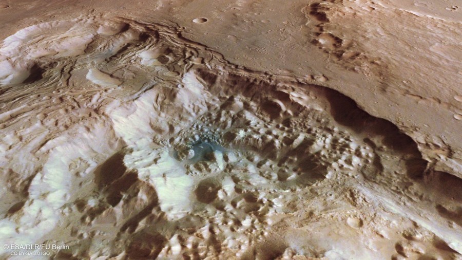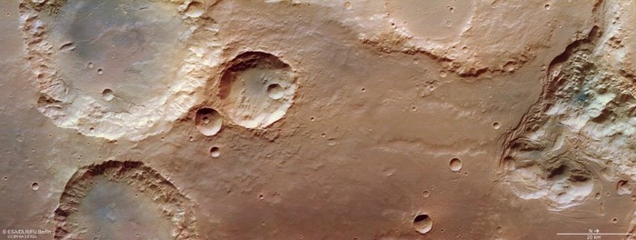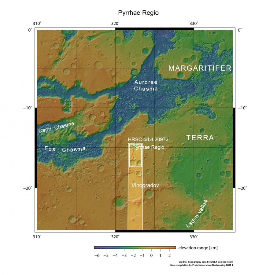 В качестве примера можно привести следующие изображения, полученные миссией Mars Express. На них запечатлен участок Марса, известный под названием Страна Пирры (Pyrrhae Regio). Снимки из космоса демонстрируют хаотический пейзаж, сформировавшийся в результате падения астероидов и ледниковой активности.
