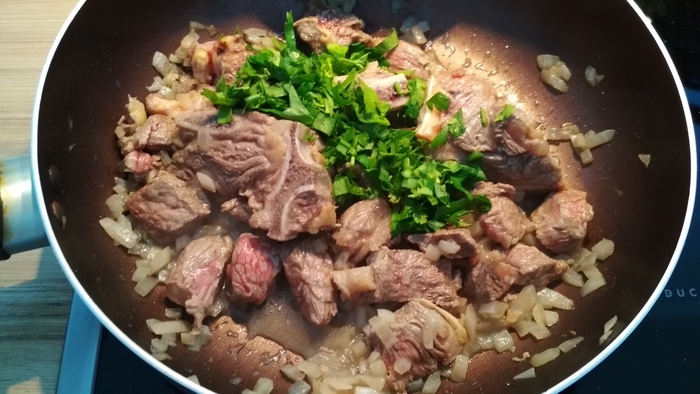Обжарить мясо с луком (недолго) и добавить мелко порубленную зелень петрушки.