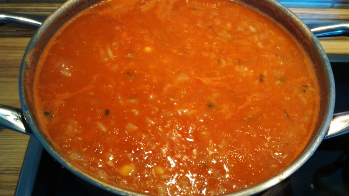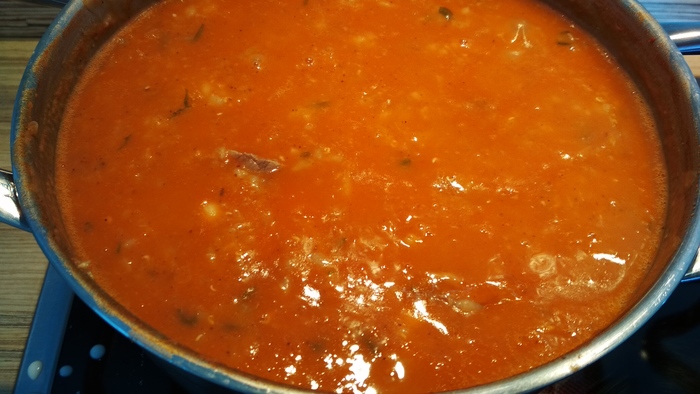 На этом этапе добавляете в суп столовую ложку томат-пасты (если использовали свежие помидоры). Это в основном для красивого цвета ))