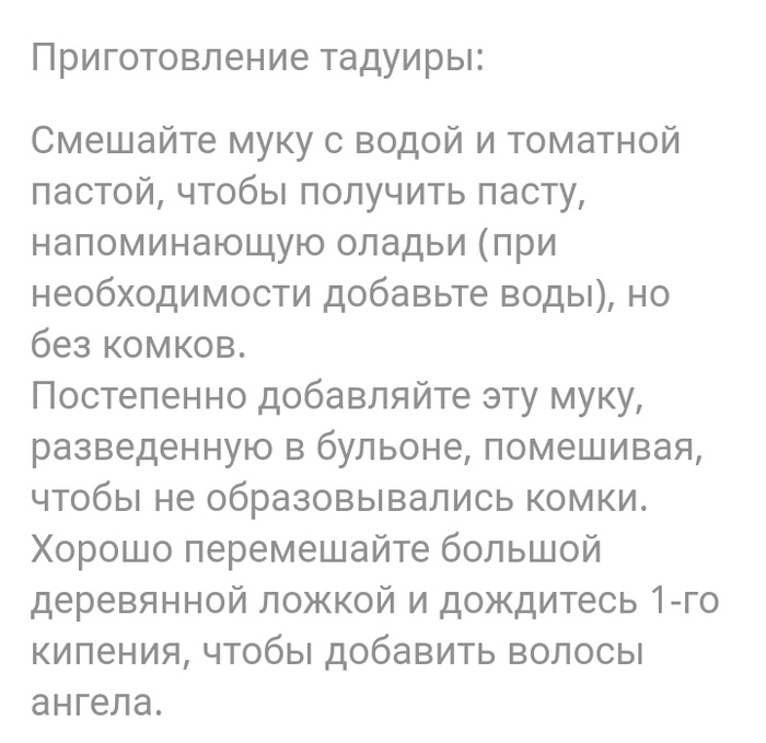 В ходе подготовки рецептов, я часто иду на форумы тех стран, где традиционно готовят данные блюда. Пользуюсь авто переводчиком. Но иногда попадаю в тупик. Кто нибудь догадался, что за "волосы ангела" добавляют при приготовлении тадуиры (мучной болтушки)? Ответ - шафран ;-)