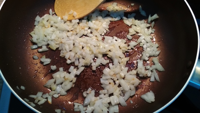 Лук немного обжарить до прозрачности и добавить мясо.